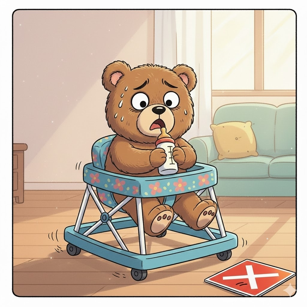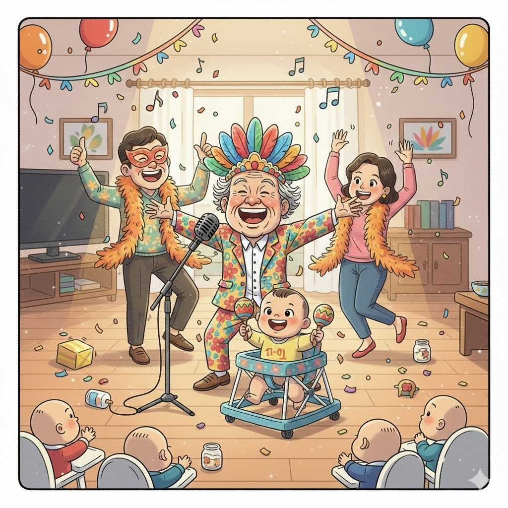 아기 앞에서 춤을 추고, 표정을 바꾸면서 재롱을 부렸는데 숨을 멈추고. 아기의 심사 결과 발표를 기다리고 있다.