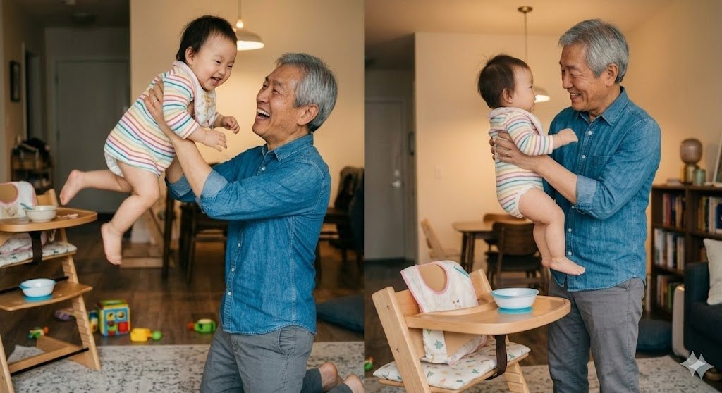 그리고 며느리가 숫가락과 이유식을 내게 넘겨주고 손주에게 먹이게 한다.