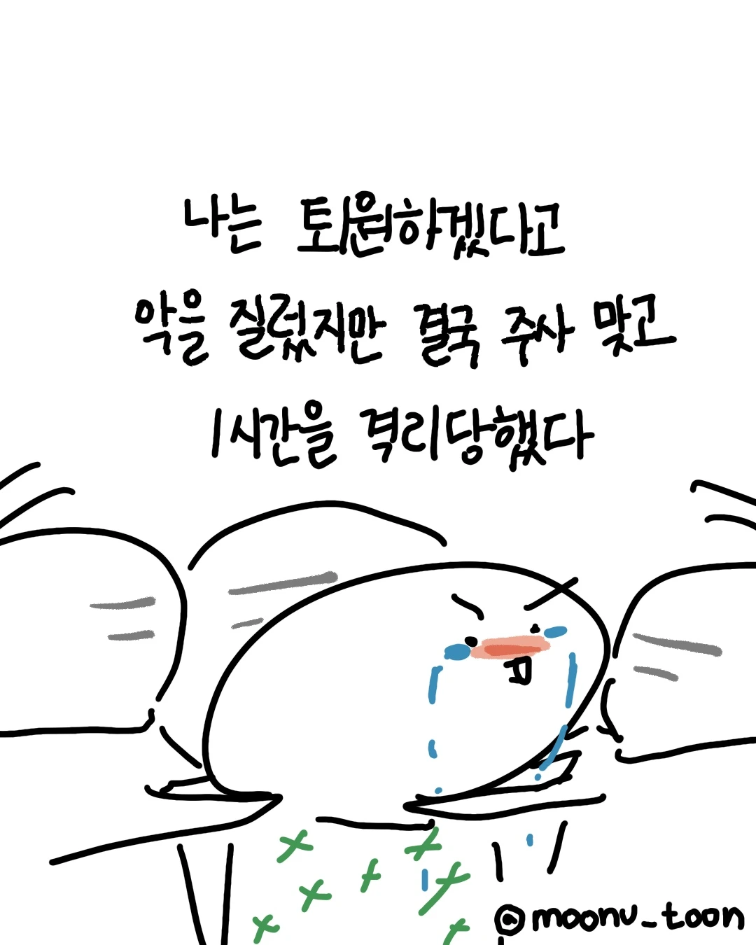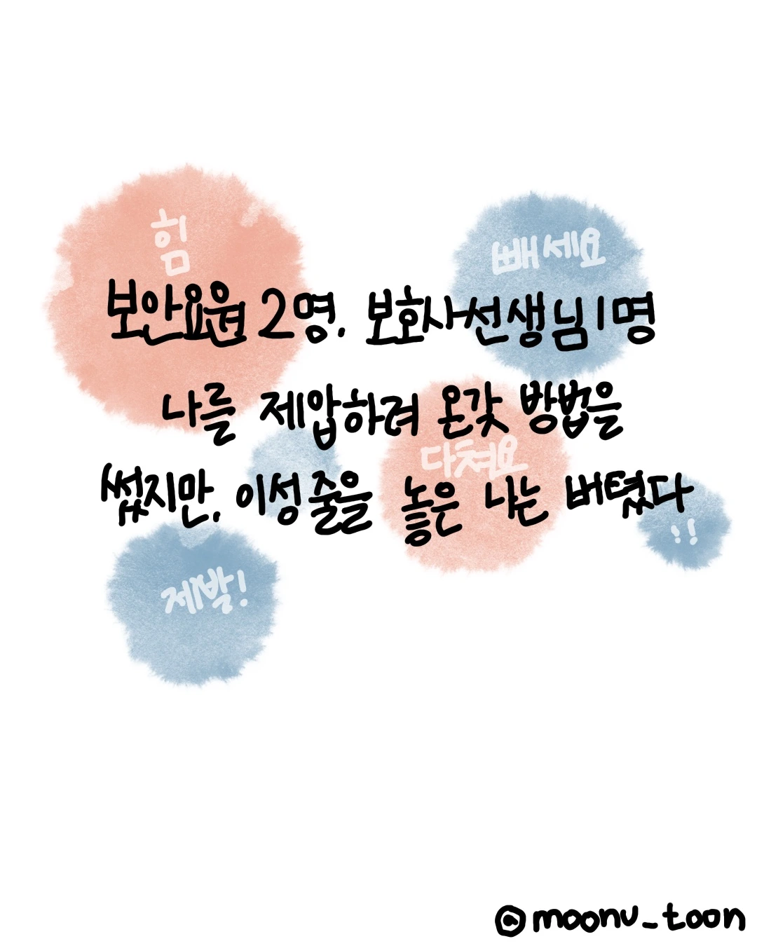 주사를 강제로 맞고 1시간 격리당하는 동안 잠이 오는걸 허벅지 꼬집으며 참았어요. 안 그러면 간호사 선생님은 교대를 할 것이고. 그러면 새로운 간호사 선생님께 화를 낼 수 도 없는 그런 억울한 상황이 생길 것 같아, 진정제 2방을 맞고도 1시간 동안 참았습니다.