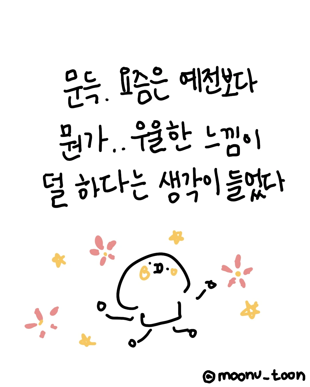 문득, 요즘은 예전보다 뭔가... 우울한 느낌이 덜 한 것 같기도 하다는 생각을 했어요! 그러다 왜 그럴까 생각해 봤지요
