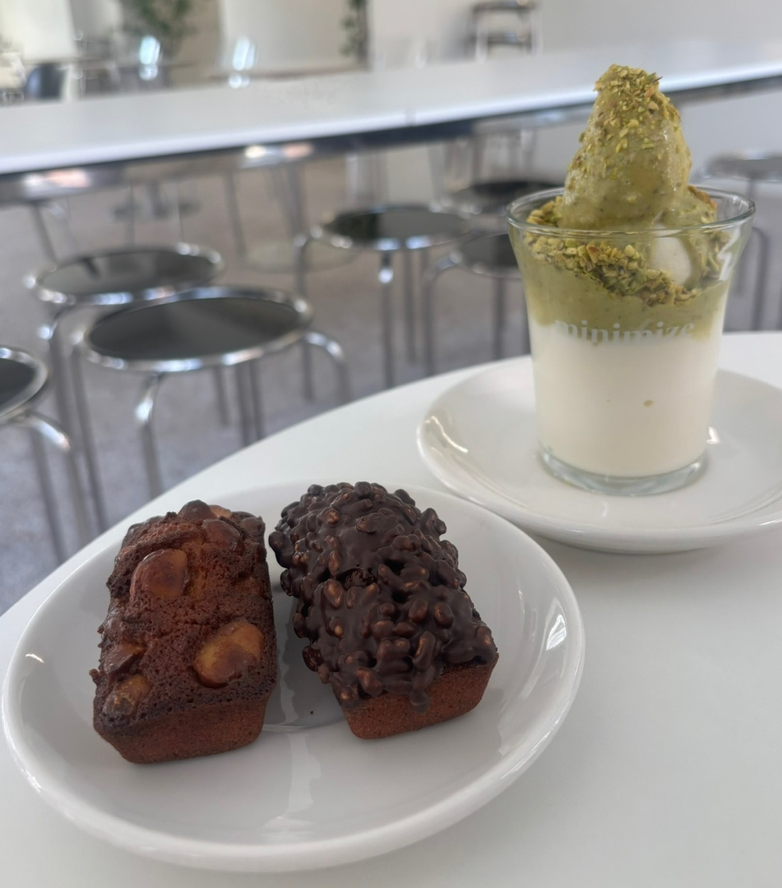 디저트는 그때그때 종류가 조금씩 바뀌지만 치즈케이크, 보틀케이크와 계절파르페가 유명한데, 어떤 맛을 먹어도 물리지 않고 깔끔하게 먹기 좋다. 거기에 미낭시에라고 쌀로 만든 휘낭시에도 판매하는데, 쫀득한 맛이 일품이다.