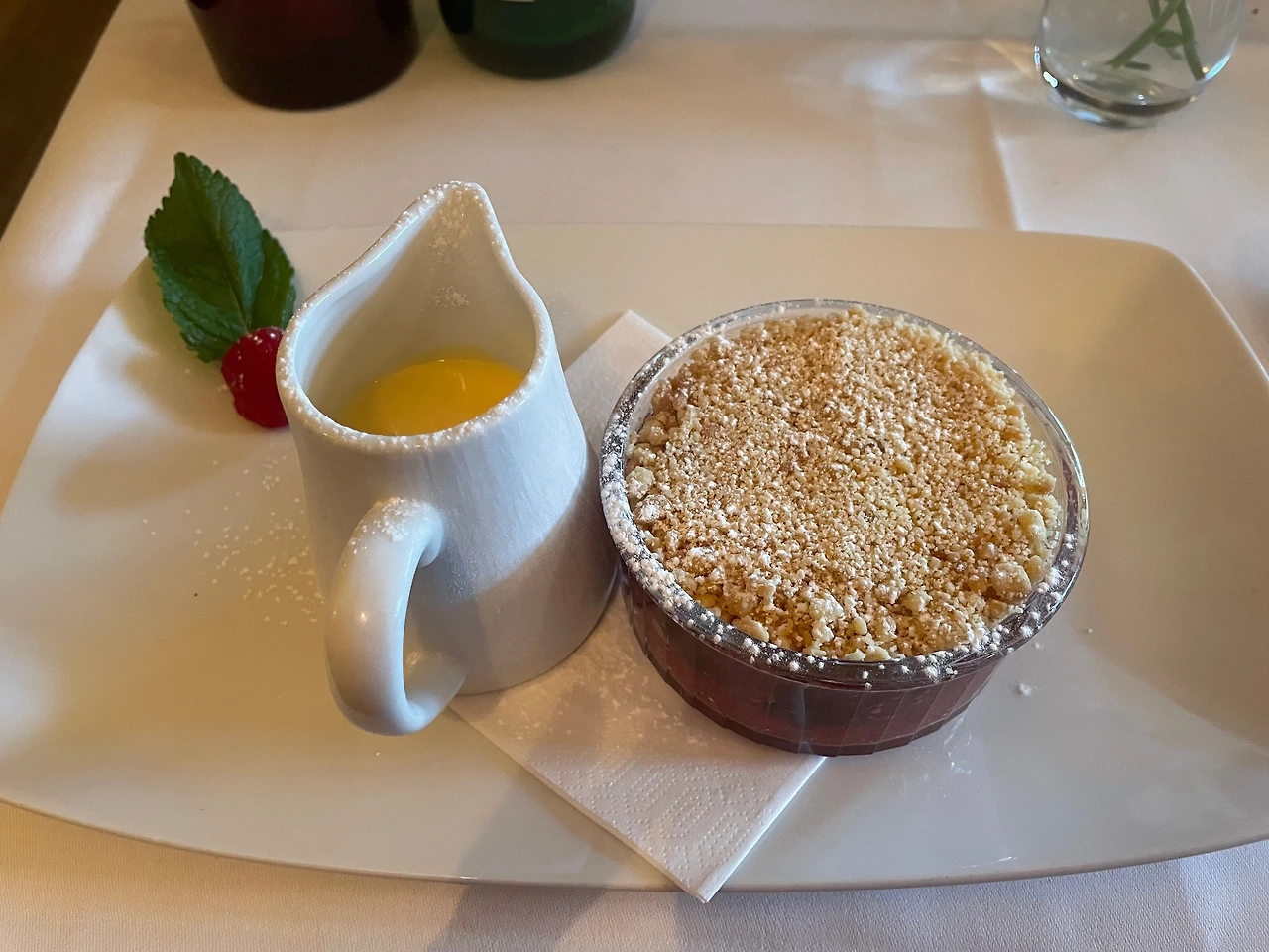 캠브리지에서 비프웰링턴을 맛보러 간 식당인데, 디저트에 애플크럼블이 있길래 즉석에서 디저트로 주문했 던 곳으로 고급스러운 레스토랑이었던 만큼 고급스러운 플레이팅에 크럼블이 제공되었다.