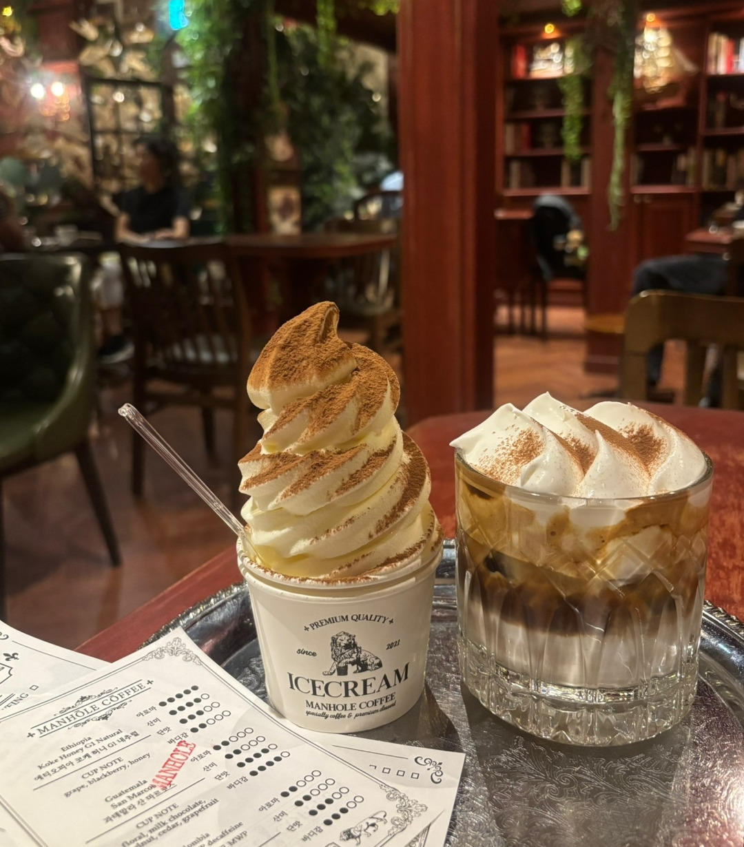 살구와 아몬드의 조화가 돋보이는 '라이트' 아인슈페너와 함께 소프트아이스크림을 주문했는데, 주문한 메뉴는 카페와 어울리는 은색 트레이에 주시고, 함께 엔틱한 주문서도 같이 주셔서 한번 더 분위기에 취하게 해준다.
