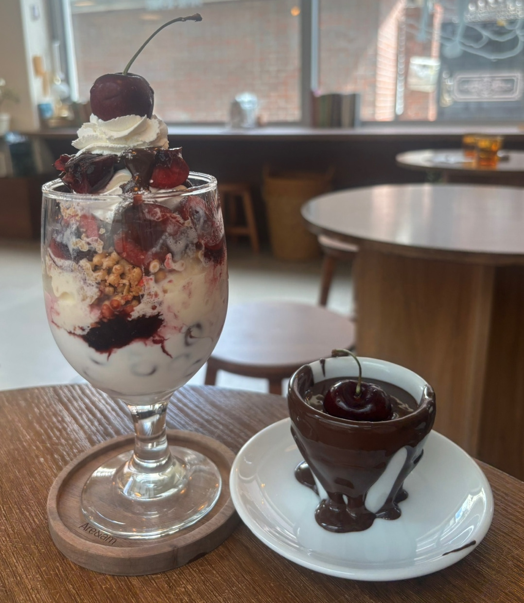 사진 속 메뉴는 체리파르페랑 초콜릿 스프인데 체리파르페는 '체리 포레누아'로 잘 알려진 초코와 체리의 조합에 시원한 아이스크림과 그레놀라가 더해져 맛있었고, 초콜릿 스프는 진한 초코 한가득이라 당충전 제대로되는 맛이 좋았다.