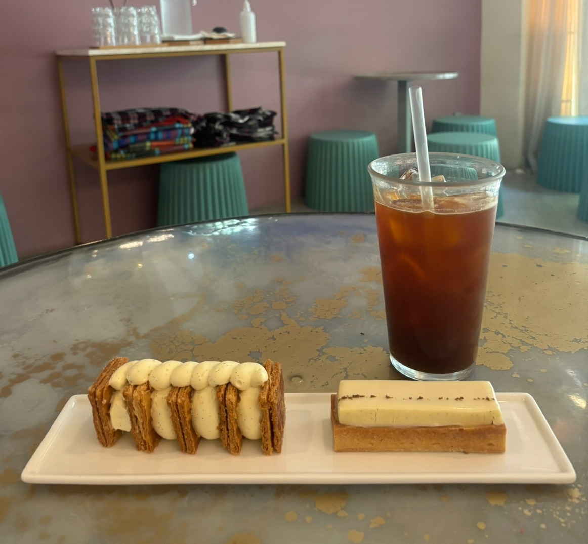 우선 밀푀유바니는 바삭한 밀푀유 사이사이에 바닐라크림이 가득 들어간 디저트였는데, 바닐라크림에는 바닐라풍미가 가득한데다가 부드럽고 깊은 맛이 느껴졌고, 밀푀유는 바사사사 부서지는 결이 예술이었는데 살짝 짭쪼롬한 맛도 함께 느껴져서 단짠단짠의 맛이 예술이었다.