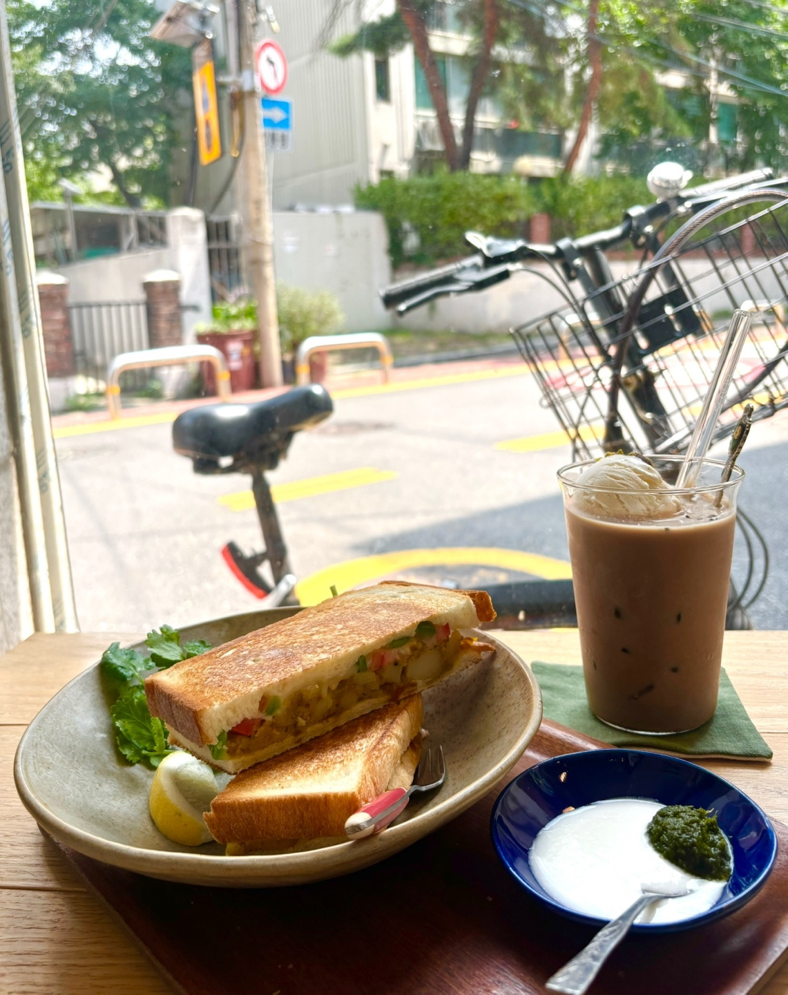 여기서는 가장 특색이 느껴지던 아이스크림 코코아 짜이와 함께 알루핫샌드를 주문했는데, 짜이는 인도에서 먹는 초코라떼 위에 아이스크림이 올라간 느낌이었고, 샌드위치는 감자가 들어가 든든하면서 적당히 이국적이고, 그러면서도 호불호 없는 맛이었다.