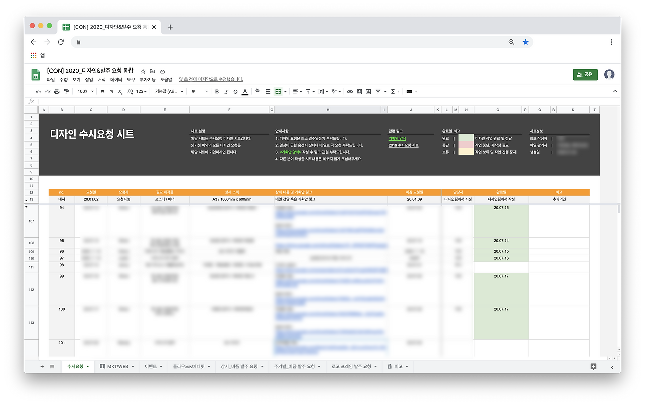 회사에서 필요한 디자인 업무의 90% 이상은 위의 시트에 기입되고 히스토리가 쌓이다 보니 나름의 데이터로 활용할 수 있었습니다.