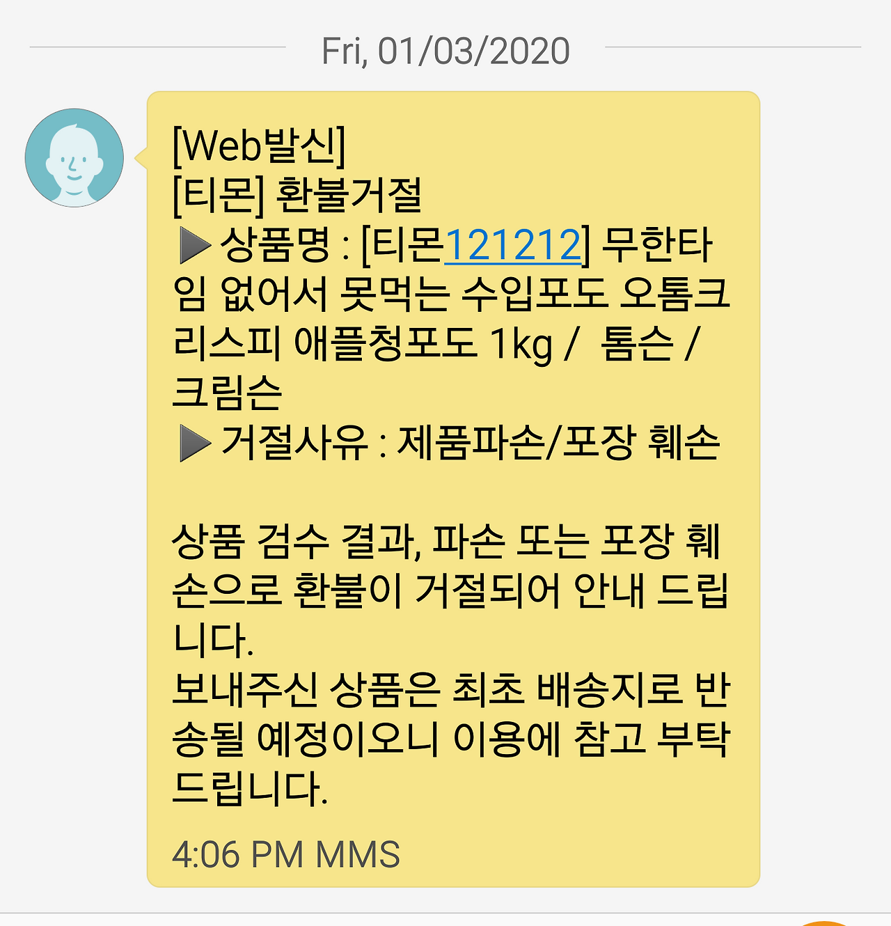 상한 포도가 처음 도착한 지 일주일 후인 1월 3일 금요일 밤에 티몬에서 또 문자를 받았습니다. 환불 거절 메시지와 함께 상품 (음식물 쓰레기)을 다시 우리 집으로 되돌려 보내겠다는 내용이었습니다. 이 포도 사건으로 그동안 이용해 왔던 티몬과의 거래를 끊습니다. 저는 티몬을 믿었기에 그동안 티몬을 통해 구매를 해 왔습니다. 고객이 티몬에서 물건을 파는 사업자에게 피해를 입었을 때 티몬은 아무런 도움을 주지 않고 오히려 악덕 사업자 편에 서서 고객에게 실망을 주었기에 그런 기업은 더 이상 지원하지 않습니다. 티몬에게 저는 많은 고객 중의 한 명일뿐이겠지요. 하지만 티몬 역시 저에게는 온라인으로 구매를 할 수 있는 많은 기업 중에 하나일 뿐입니다.