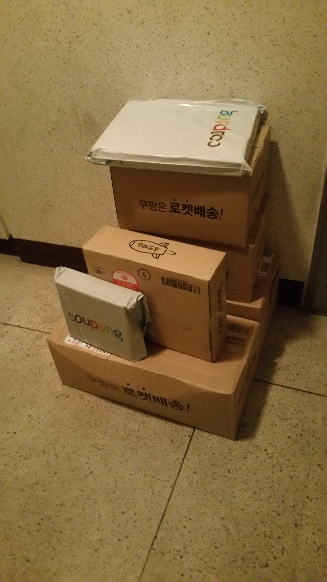 정말로 어젯밤 늦게 주문한 물건들이 하나도 안 빠지고 24시간도 채 안돼서 다 배달된 것이다. 낮에 <물건이 배송되었다>는 안내 문자를 받았지만 전부 다 왔을 거라고는 생각하지 못했다.