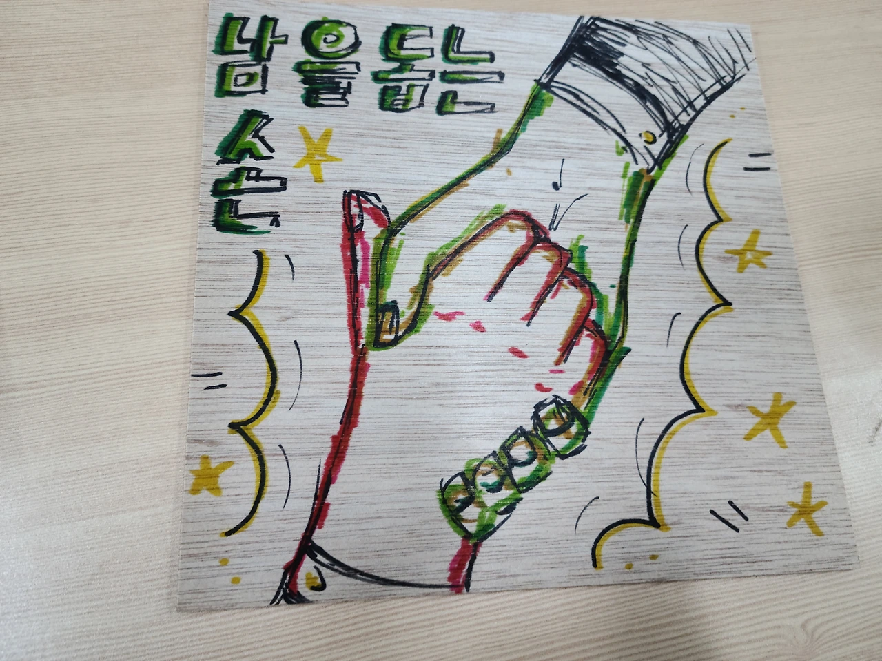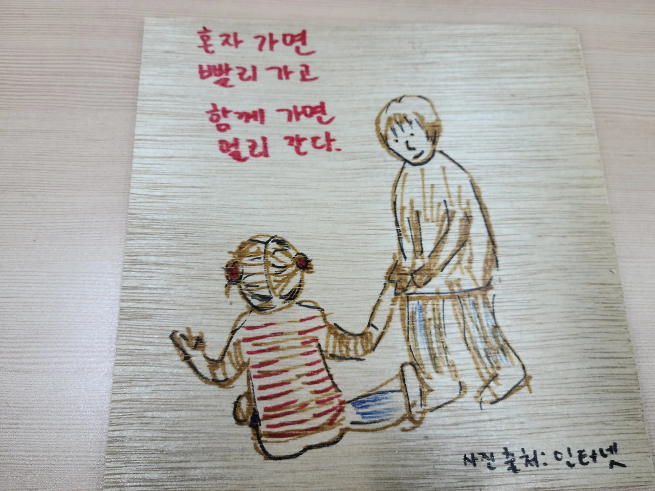 체험 학습의 마지막 활동은 본인이 생각하는 자원봉사를 그림으로 표현하는 것이었다. 이럴 줄 알았으면 체험학습을 시작할 때 벽화 경험이 있는지 물어봤을 때 침묵했을 것이다. 막상 눈앞에 나무 조각과 사인펜이 놓여 있으니 난감했다. 딸은 인터넷으로 찾은 사진을 보며 그침 없이 그려 나갔다.