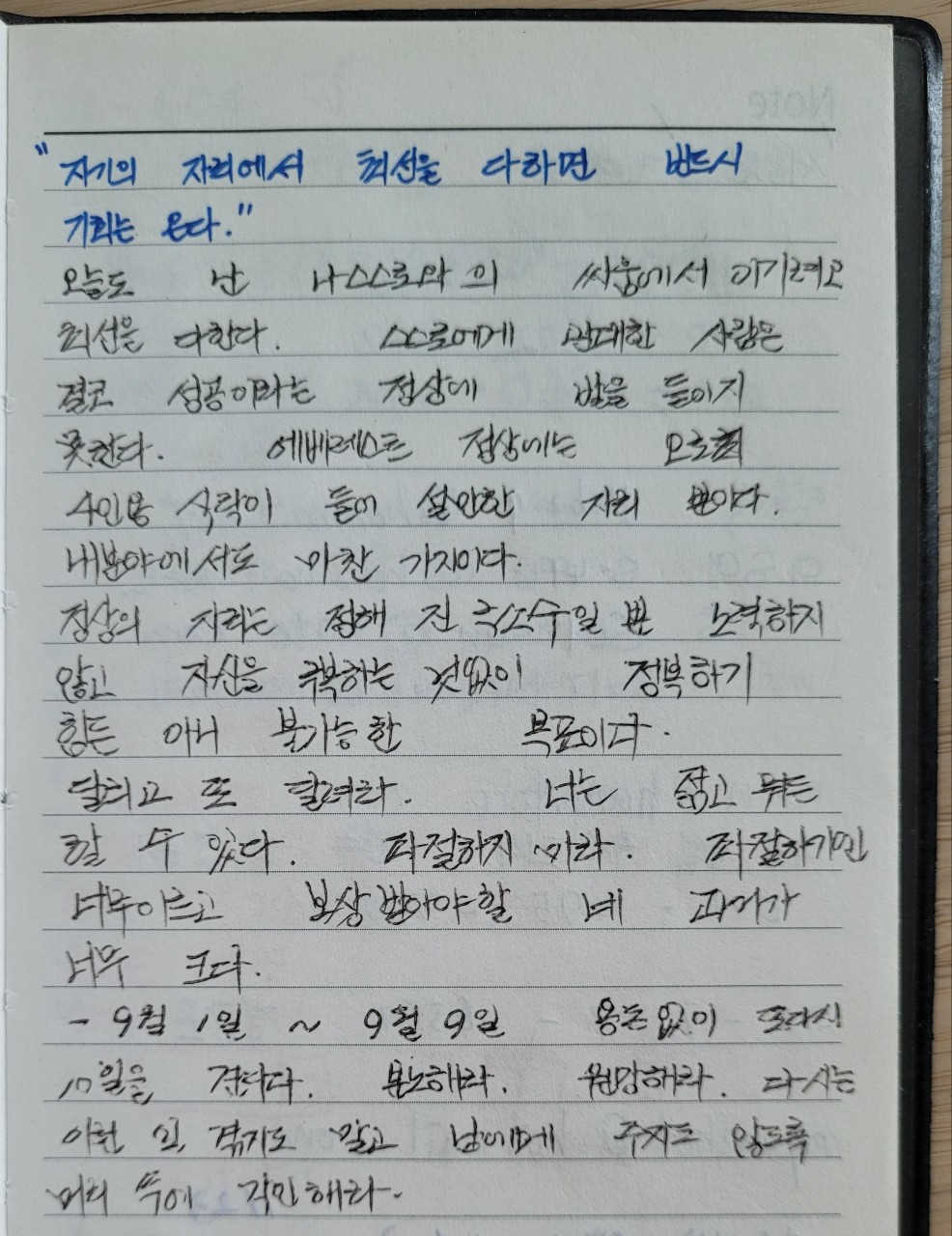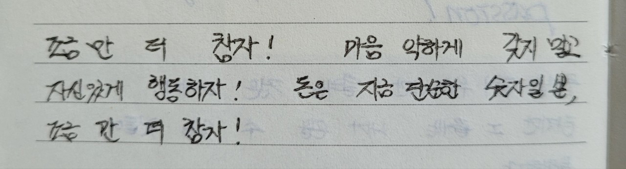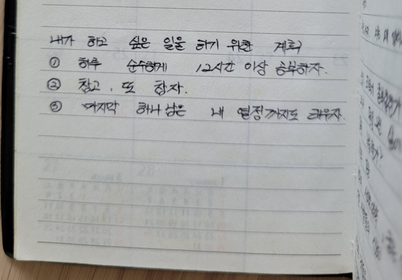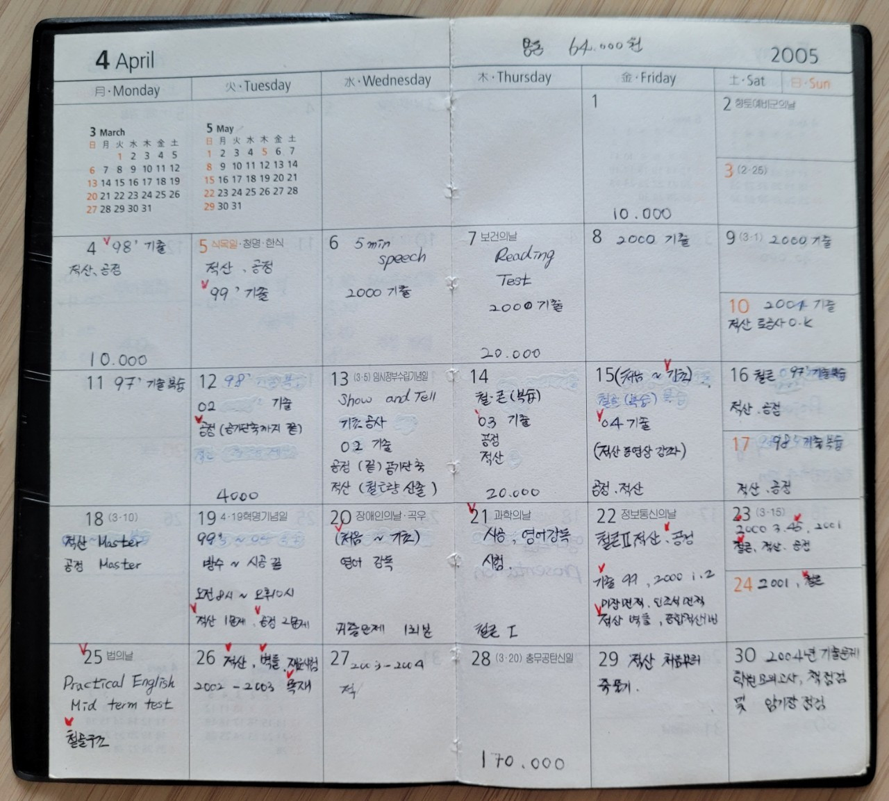 2005년 개인수첩에 적었던 각오/다짐들지옥 같았던 상황을 청산할 방법은 오직 하나, 내가 잘하고 좋아하는 전공(건축공학)을 살려 튼튼한 건설사에 입사해 승승장구하는 것이라고 생각했다. 제대 이후, 일/주/월/학기/년 단위로 계획표를 작성하여 실천해 나갔다. 두 번의 기회는 없으며 계획한 일들 중 하나라도 부족하면 실패한다는 강박관념 휩싸여 기계적으로 해야 할 일을 하나 씩 지워나간 결과, 전 학기 장학금을 받은 것은 물론, 대학 4학년 여름방학 즈음 취업을 위해 기본적으로 요구되는 조건(학점, 토익점수, 자원봉사, 건축 기사 및 건설 안전기사와 같은 관련 자격증 취득)들을 과에서 가장 먼저 갖추게 되었다. 대학 졸업 후 만난 후배 하나는 재학 시절 나를 '무섭고, 징그러웠다.'라고 표현을 했는데, 그때 나는 아무렇지 않다는 듯 웃고 말았지만 쓰디쓴 추억이 되살아나서 나도 모르게 진저리를 쳤었다.