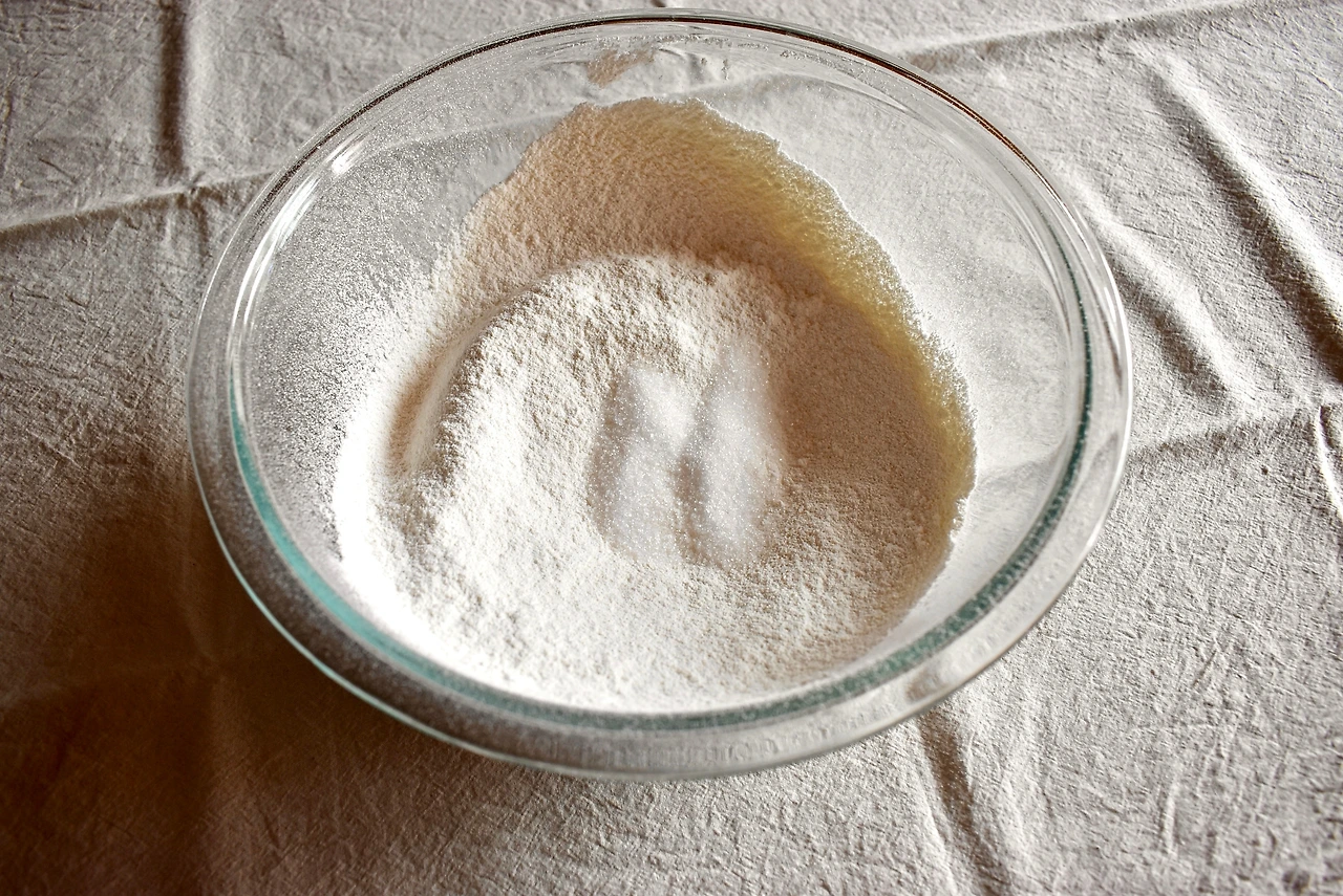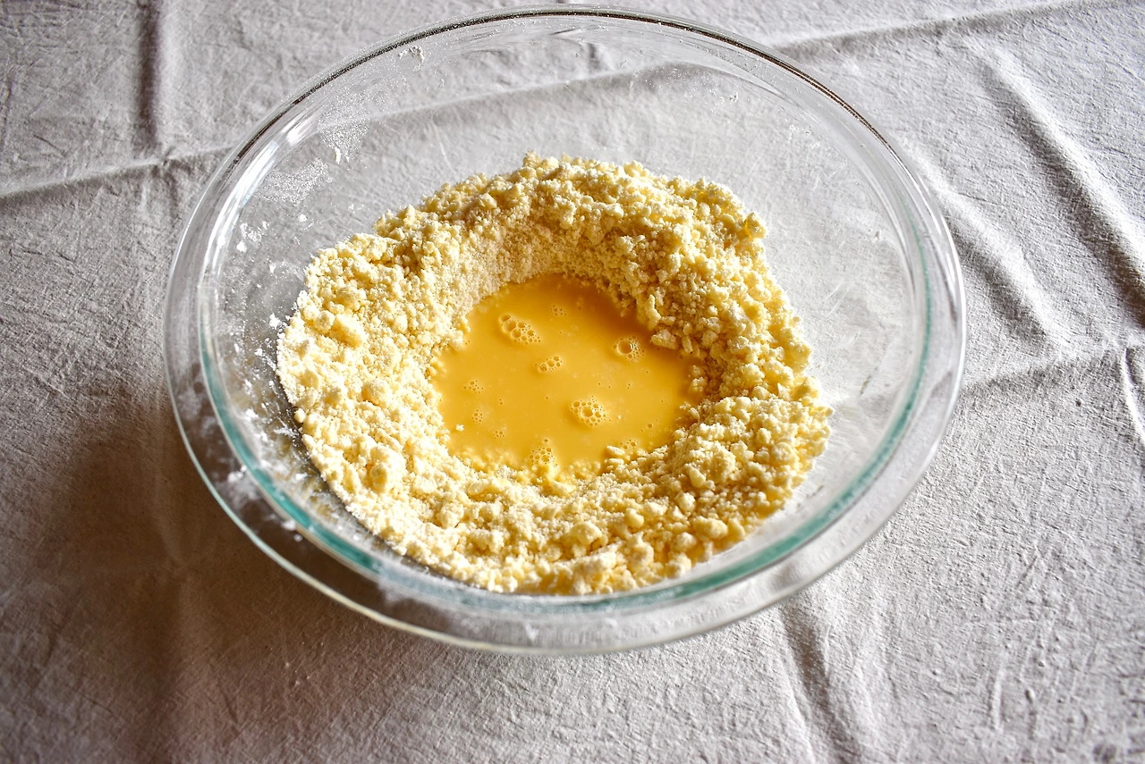 차가운 물과 달걀노른자를 섞어서 부어주세요.