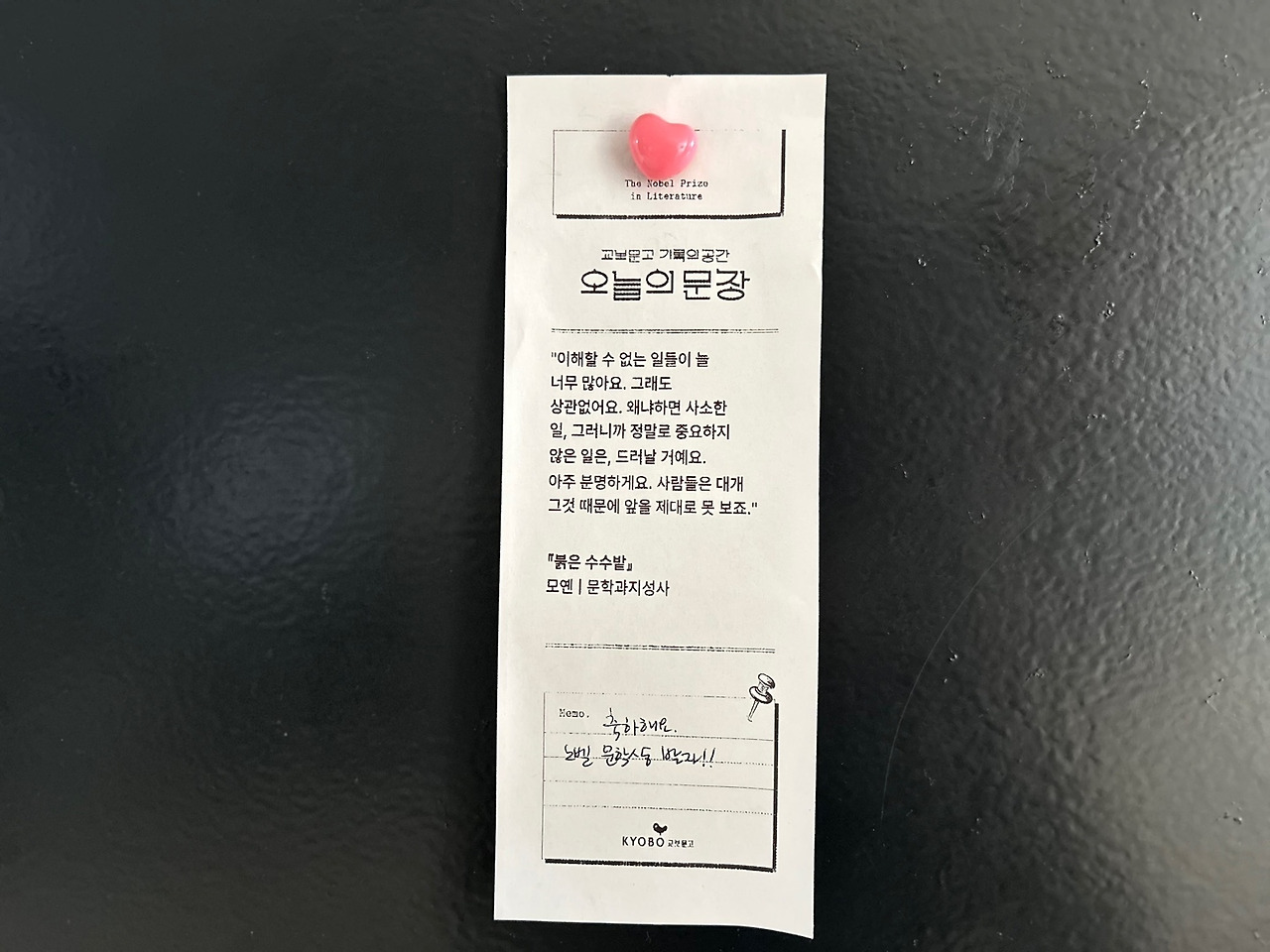 하원할 때 내가 미처 챙기지 못한 우리 아이 간식까지 늘 챙겨줬고 육아에 지쳐하는 나와는 달리 놀이터에서 무궁화꽃이 피었습니다를 하며 아이들과 열정적으로 놀아주는 사람이었다. 내가 브런치 작가에 붙은 소식을 전하자 그녀는 티라미수와 함께 노벨문학상을 받은 붉은 수수밭의 구절이 적힌 교보문고의 쪽지에 축하의 메시지를 적어주었다. 이렇게도 잔잔하게 다정하다니! 갑자기 나타난 온화한 이웃이자 유치원 메이트, 은후엄마에게 나와 우리 아이는 스며들고 말았다.