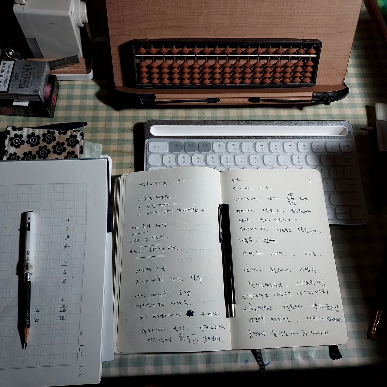 연필에 관한 예찬을 늘어놓기는 했지만 뭔가를 쓸 일이 있으면 펜을 선호한다. 아버지 유품인 파커 만년필은 저가형 모델이라 굵기도 얇고 촉도 엉망이어서 썩 훌륭하다 말하기는 어렵지만 그럭저럭 쓸만하다. 그동안의 경험담과 생각들을 수기 형식으로 쓰다가 문득 '소설을 써볼까' 하는 생각이 들어서 노트에 만년필로 계획을 써봤다.