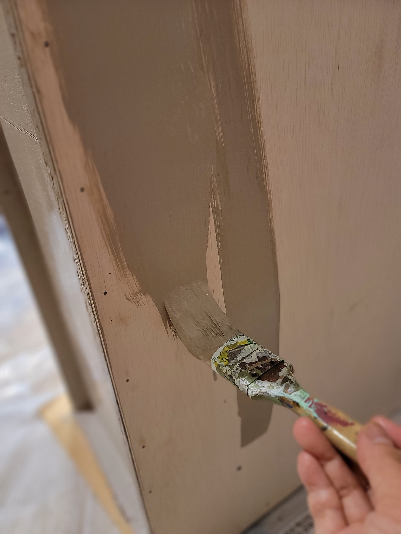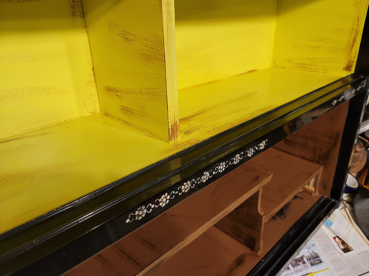 윤희 씨네 수국 농장에서 마지막 생애를 보내고 있던 자개 찬장을 모셔와 복도에 방치해 둔 게 일 년이 넘어버려서 남아있는 것만도 용한 일이다. 천정이 무너져 떼어내 버렸고 뒤판도 겉은 일어나서 떼어 버렸고 간신히 얇은 속살만 달려 있는 상황이었다.