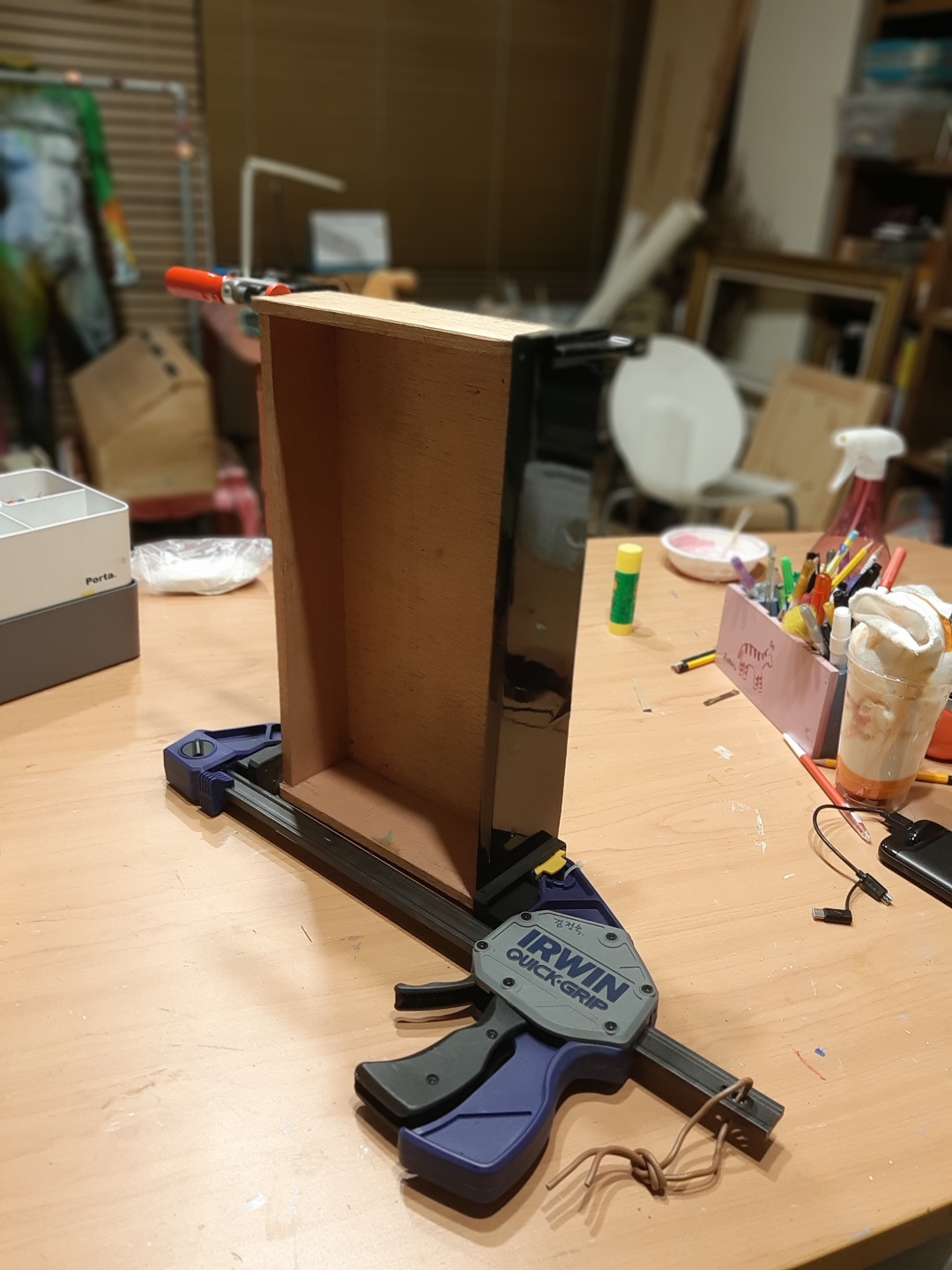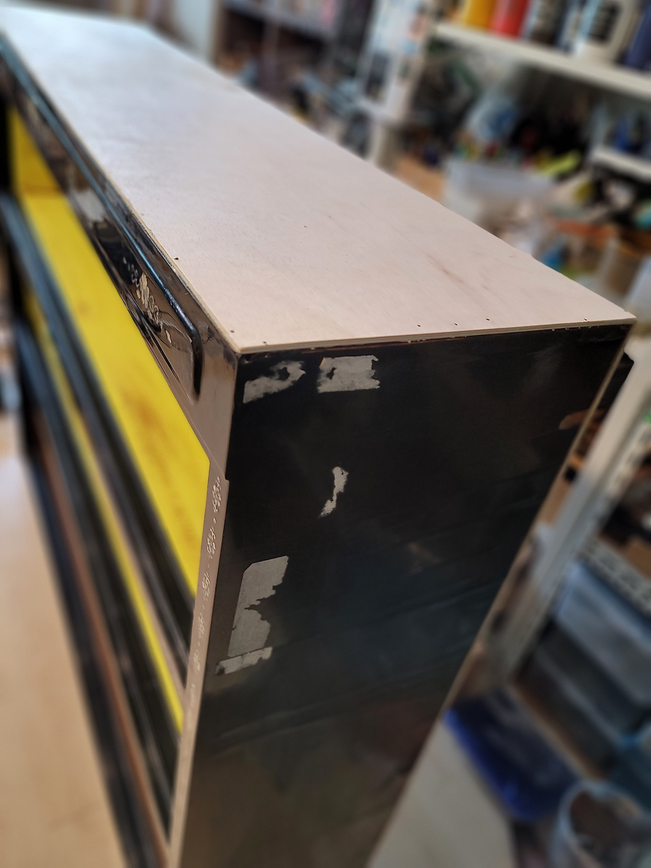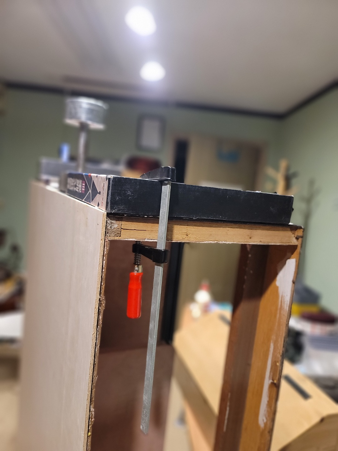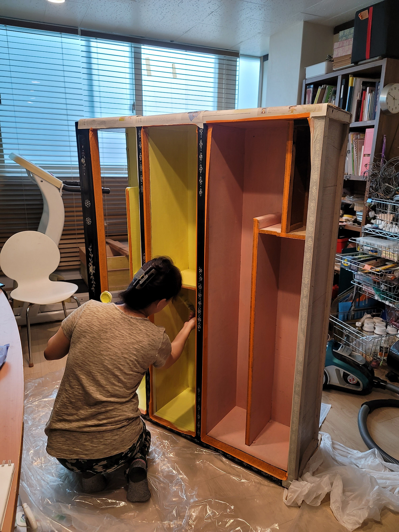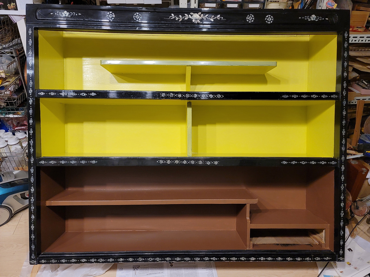 지저분해진 뒤판을 떼어내고 이미 사라진 천정까지 새로 합판을 재단해서 붙였다. 자개장이 원래 이렇게 약한 건가? 합판으로 이루어진 골격이 부실해 보인다. 합판 위에 얹어진 자개와 칠이 들떠서 맨손으로 하나하나 만져보며 접착을 하고 클램프로 고정해야 했다.