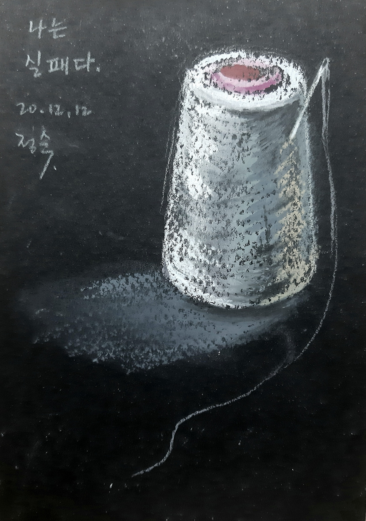실패는 바늘이 꽂혀 있을때 생동감이 느껴진다. 조명이 된 실패를 그린것은 아니지만 이 글에 어울리는 드로잉이어서 붙여 본다. 실패가 바늘을 꽂고 전사의 모습으로 섰을 때 연극무대에 선 주인공이 되어 말한다. 나는 실패다. 검정 바탕위에 흰색 실이 감긴 실패는 조명을 받은 것처럼 빛나고 온전히 자신의 이야기를 하게 된다. 거창한 해석이어야 할 말을 다 할 수 있을때가 있다. 이게 내가 하고 싶은 말이다.