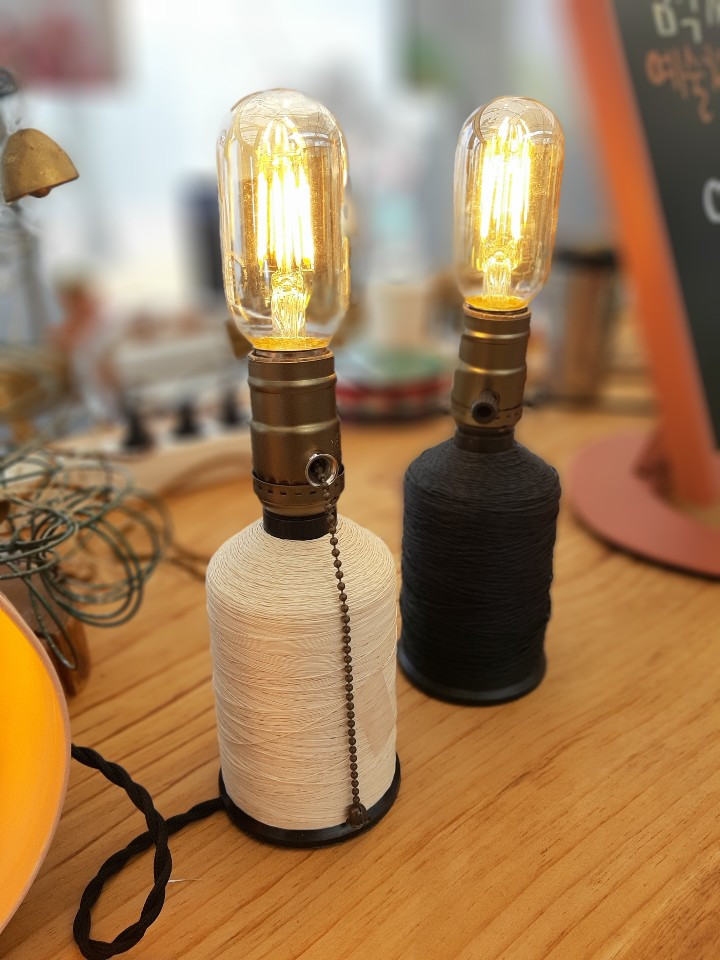북바인딩 실의 매트한 느낌에 어울리는 패브릭 꽈배기 전선과 빈티지 스타일의 브론즈 칼라 소켓, 전구는 따뜻한 느낌의 LED에디슨 전구를 사용했다. 특별히 실패들을 위해서 준비한 부품들은 아니었지만 내가 주로 사용하고 있는 재료들의 느낌이 전반적으로 빈티지하고 매트해서 어떻게 만나도 부딪히지 않는다.