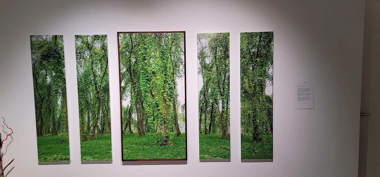 하나의 숲을 5개로 나눈 긴 세로 액자였기에 보는 재미를 더한다. 작품과 작품 사이 하얀 벽이 있어 초록이 더 싱그럽게 느껴진다.