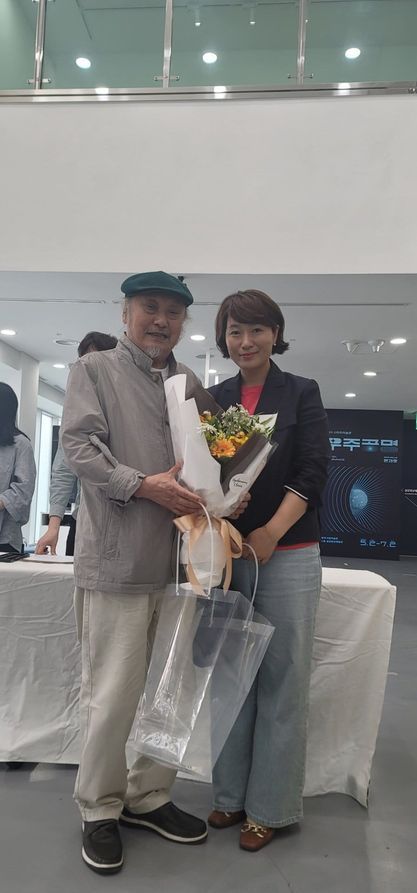 개막식 1시간 전쯤 도착해 얼른 인사드리고 와야지 하는 생각이었는데, 이미 전시장 로비는 사람들로 북적인다. 그중 한 분이 말을 건넨다. "임기자 그래 응원해" 등줄기에 땀이 삐죽 솟아오르려던 찰나에 화백님과 눈이 마주쳤다. "축하드려요. 정말 대단하세요. 좋은 에너지 많이 얻고 갈게요" 이날을 오래도록 기억하고 싶어서 화백님과 사진을 찍었다.
