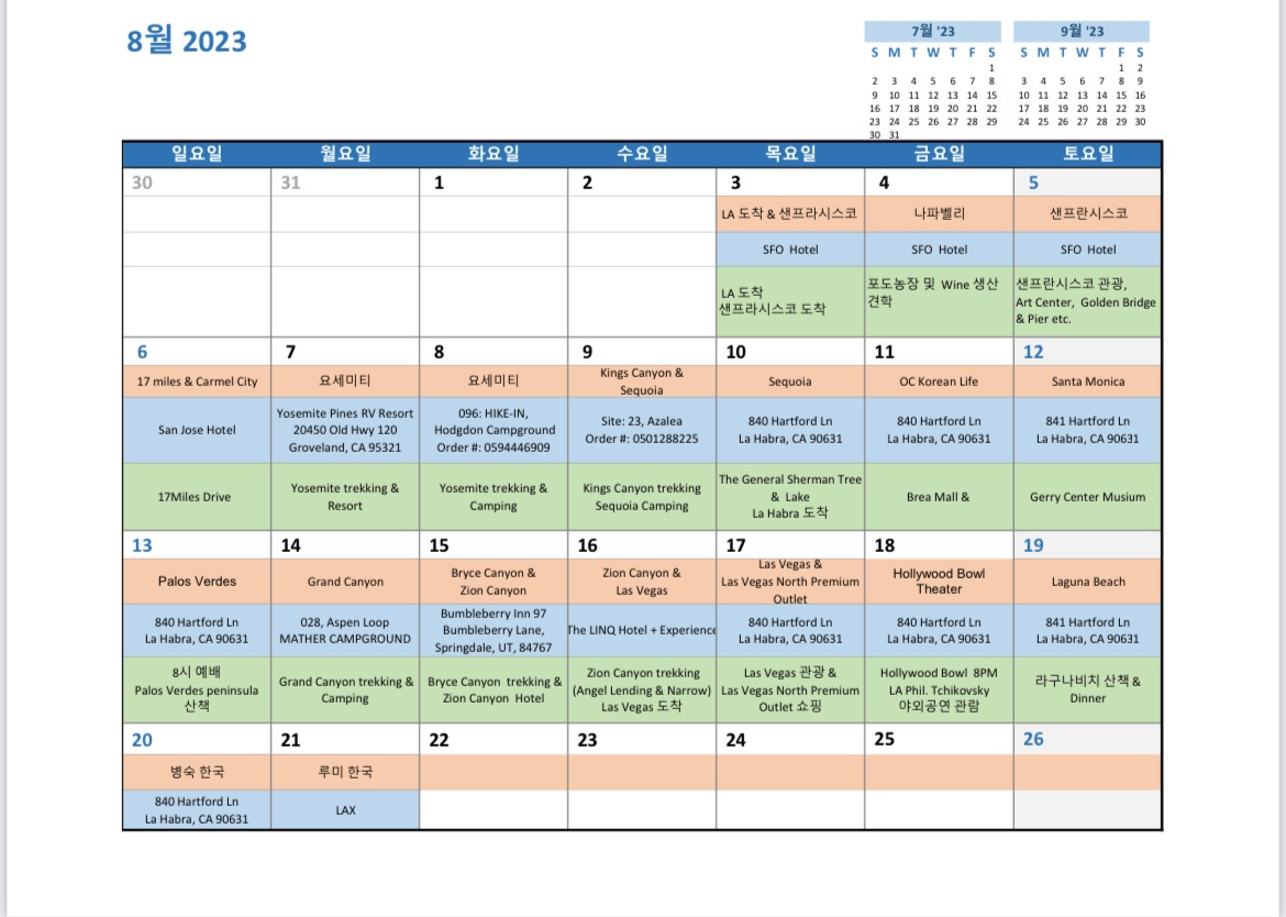 다음날인 8월 4일은 캘리포니아 와이너리 행, 5일은 샌프란시스코 여행, 6일은 17 miles 트레킹 그리고 월요일 7일 새벽 시에라네바다 산맥의 요세미티 국립공원으로 향했다. B와 C는 국제운전면허증을 갖고 왔고, A – B – C는 번갈아 가며 운전하고, 조수를 하고, 잠을 자며 다니기 시작했다. 그렇게 3박 4일의 야영을 한 후, 10일 밤에 A의 LA집에서 중간 여정을 풀었다.