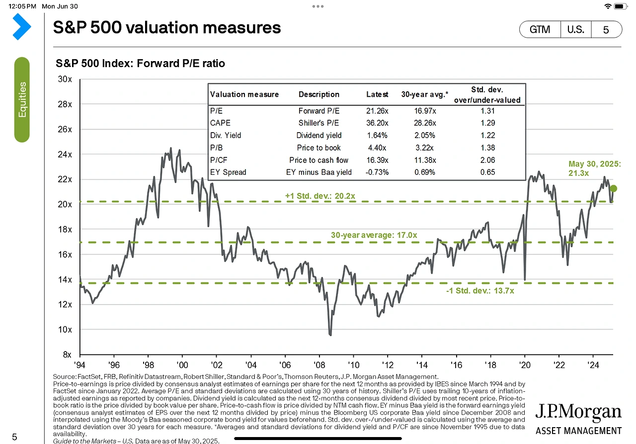 30년 평균 forward PE 평균은 16.97x이며 지난 5월말은 21.3x, 종가기준 ATH를 기록한 지난 6/27일자 forward PE는 23.2x입니다.