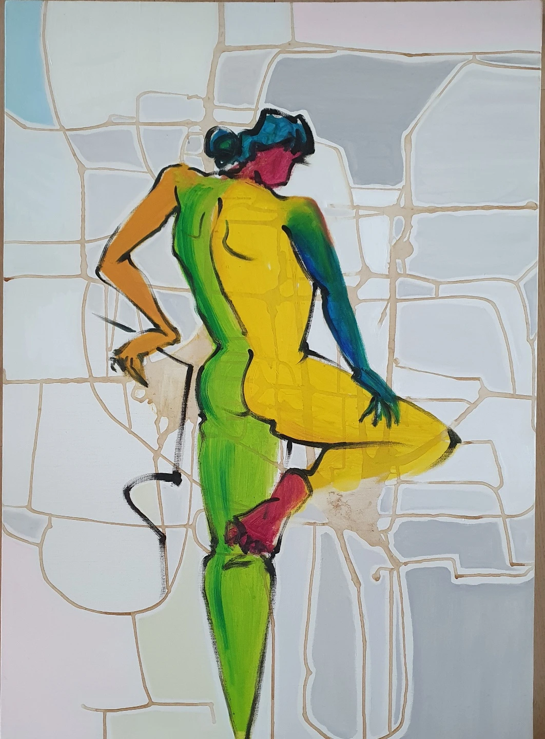 작가의 마음엔 여인의 출현 만으로는 부족했던 것 같다. 그 여인 앞에다 턱턱 선들을 던진 다음, 우연처럼 자리하고 있는 선들을 요리저리 연결해 준 다음, 그렇게 만들어진 평면들 위에다 도드러짐 없는 색의 물감을 살짝살짝 흩뿌려주니, 어느덧 큰 돌과 바위들이 모여 만든 든든한 담벼락이 듬직하게 배경이 되어있다. 작가는 그렇게 모든 이에게 평안이란 선물을 안겨 준다.
