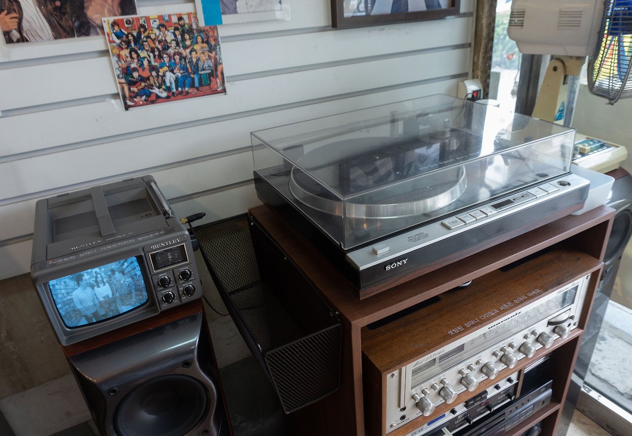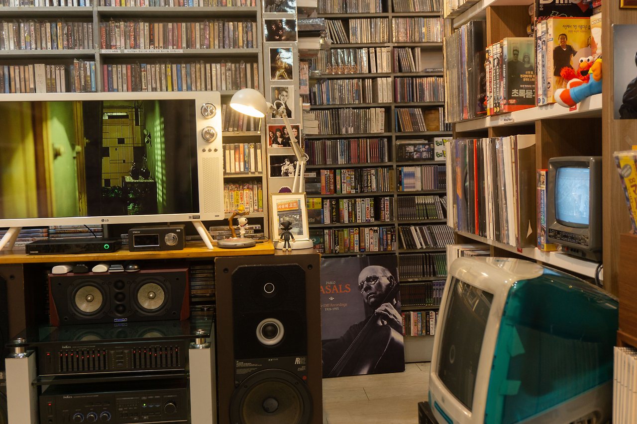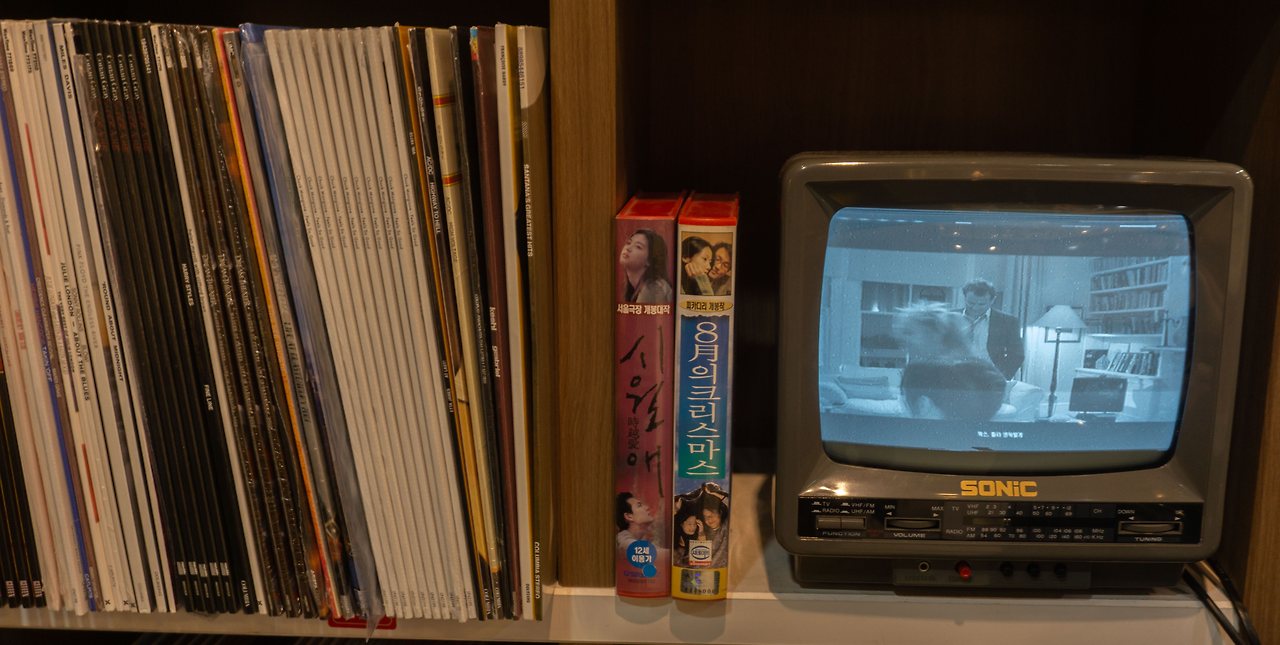 옛날 영화에 나올법한 빨간색 공중전화 부스, 브라운관 티비와 오래된 턴테이블, 흘러나오는 옛 노래들… 서울 레코드에 가면 볼 수 있는 장면들입니다. 턴테이블 주변에는 오래된 애플 티비와 귀여운 미니언즈가 있었어요. 티비에서 흘러나오는 <화양연화>는 빈티지한 감성을 더해주네요.
