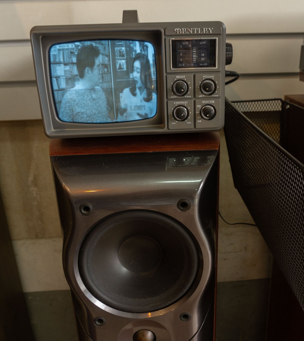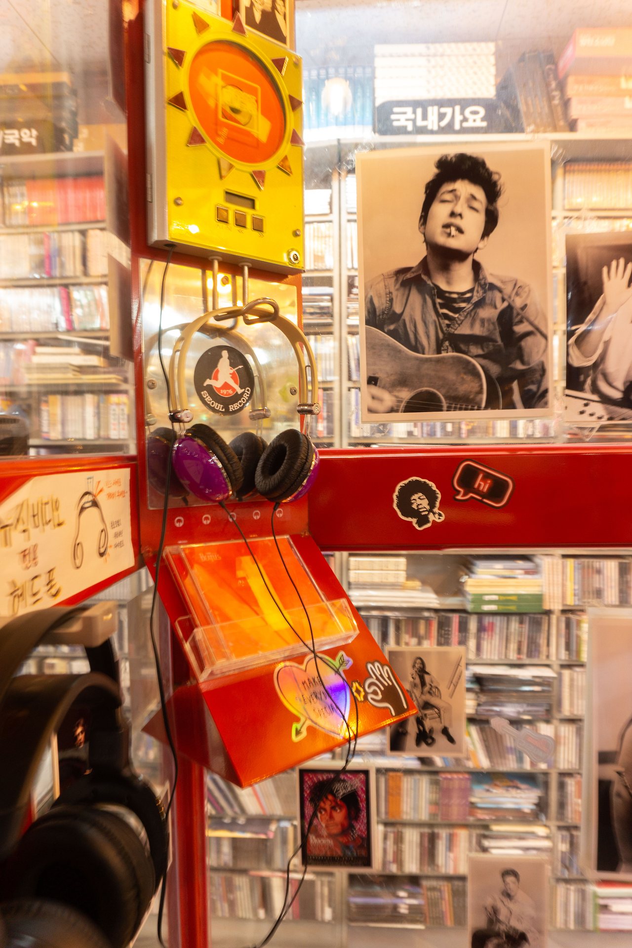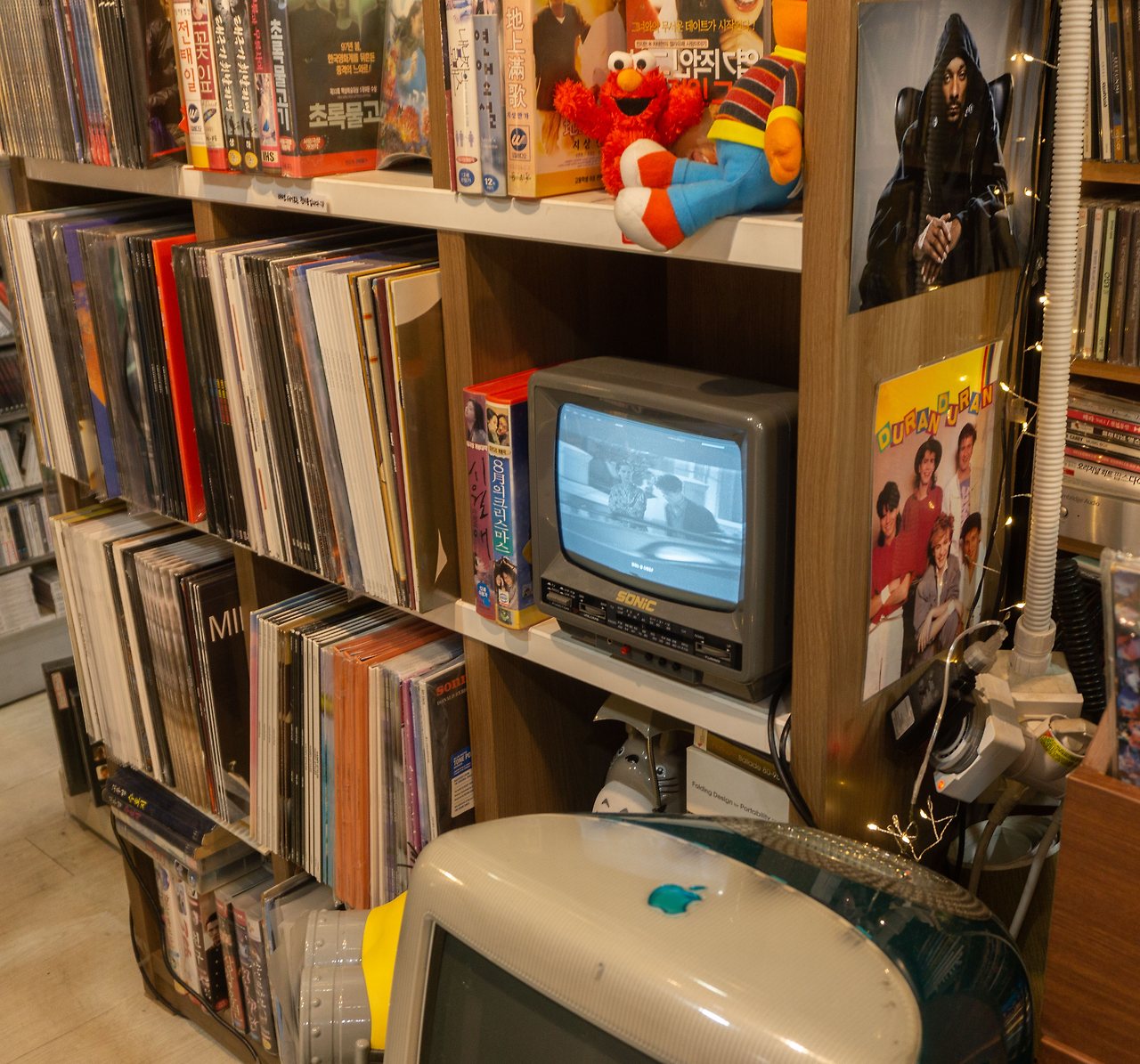 옛날 영화에 나올법한 빨간색 공중전화 부스, 브라운관 티비와 오래된 턴테이블, 흘러나오는 옛 노래들… 서울 레코드에 가면 볼 수 있는 장면들입니다. 턴테이블 주변에는 오래된 애플 티비와 귀여운 미니언즈가 있었어요. 티비에서 흘러나오는 <화양연화>는 빈티지한 감성을 더해주네요.