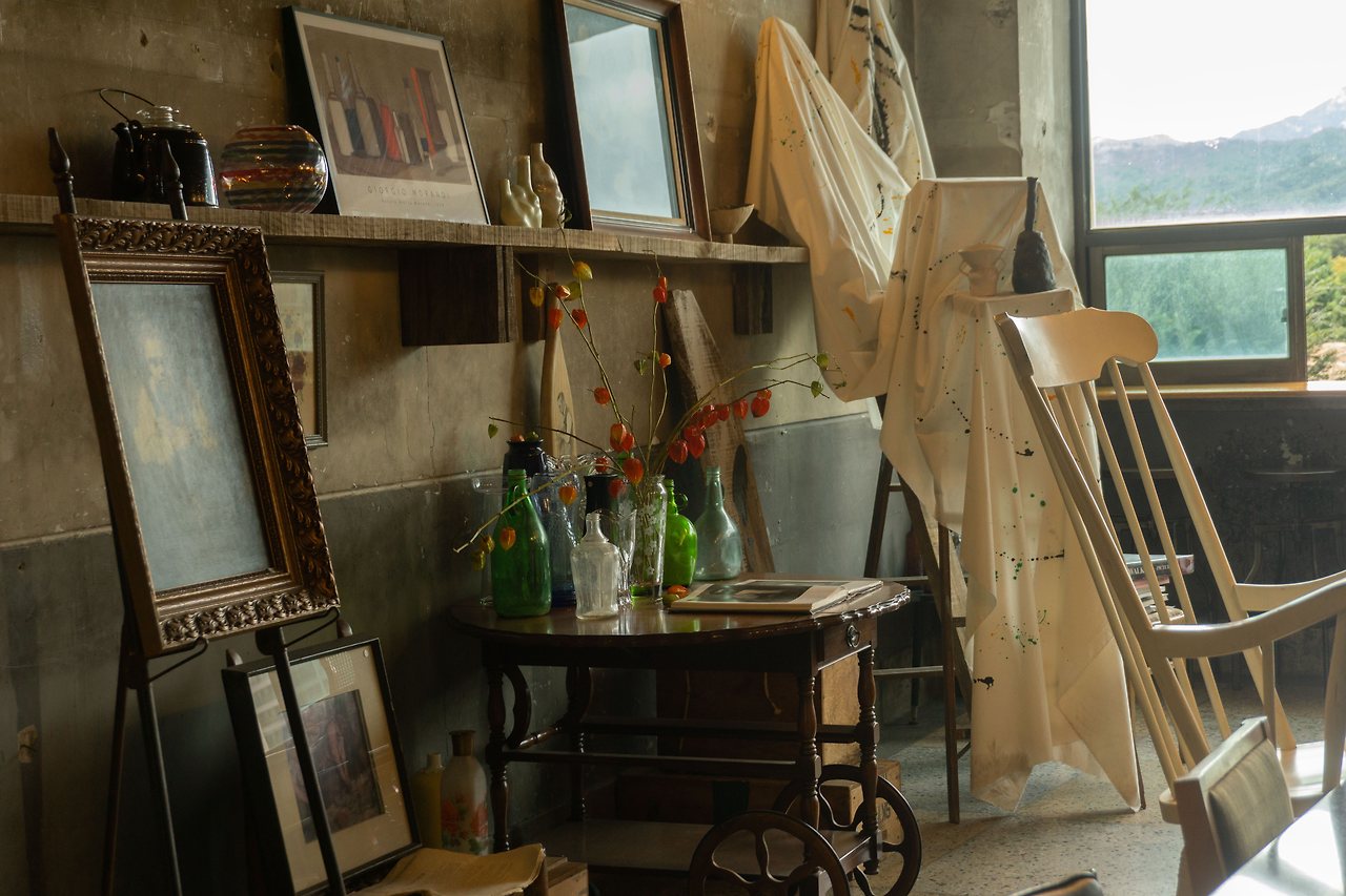 다른 한 쪽은 독특한 의자들과 크고 작은 테이블들이 놓여있고 창 밖의 뷰를 보며 먹을 수 있는 바테이블도 있다. 이 곳에 유럽풍 가구들과 찻잔, 그림들이 많이 놓여있어 화가의 작업실 같은 느낌을 준다.