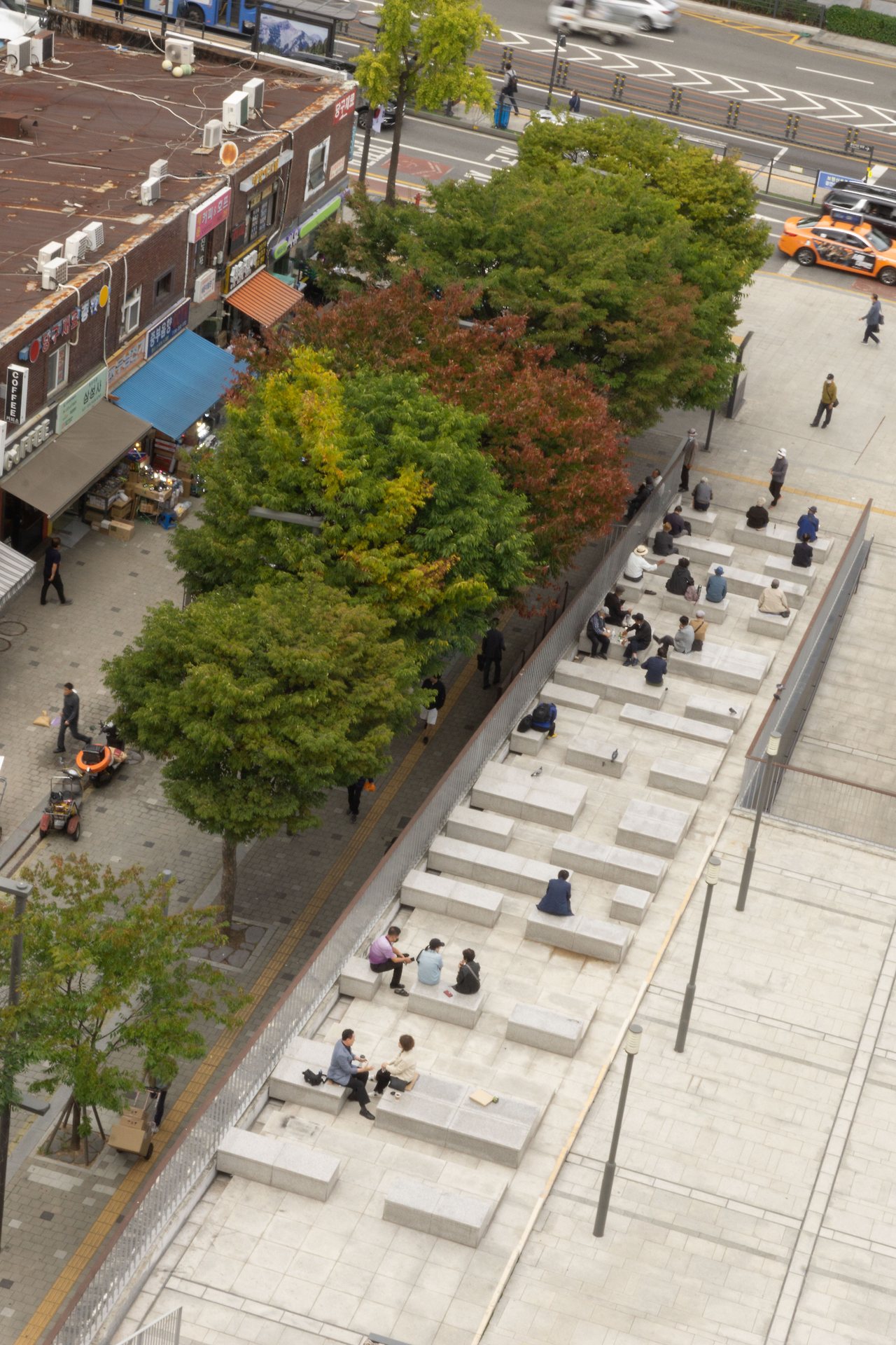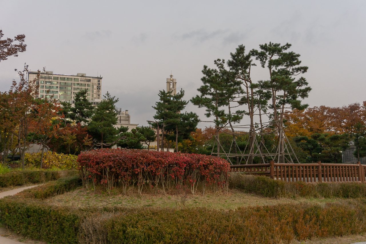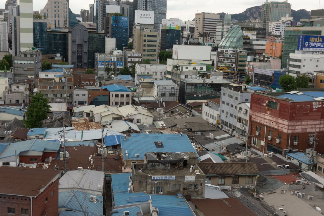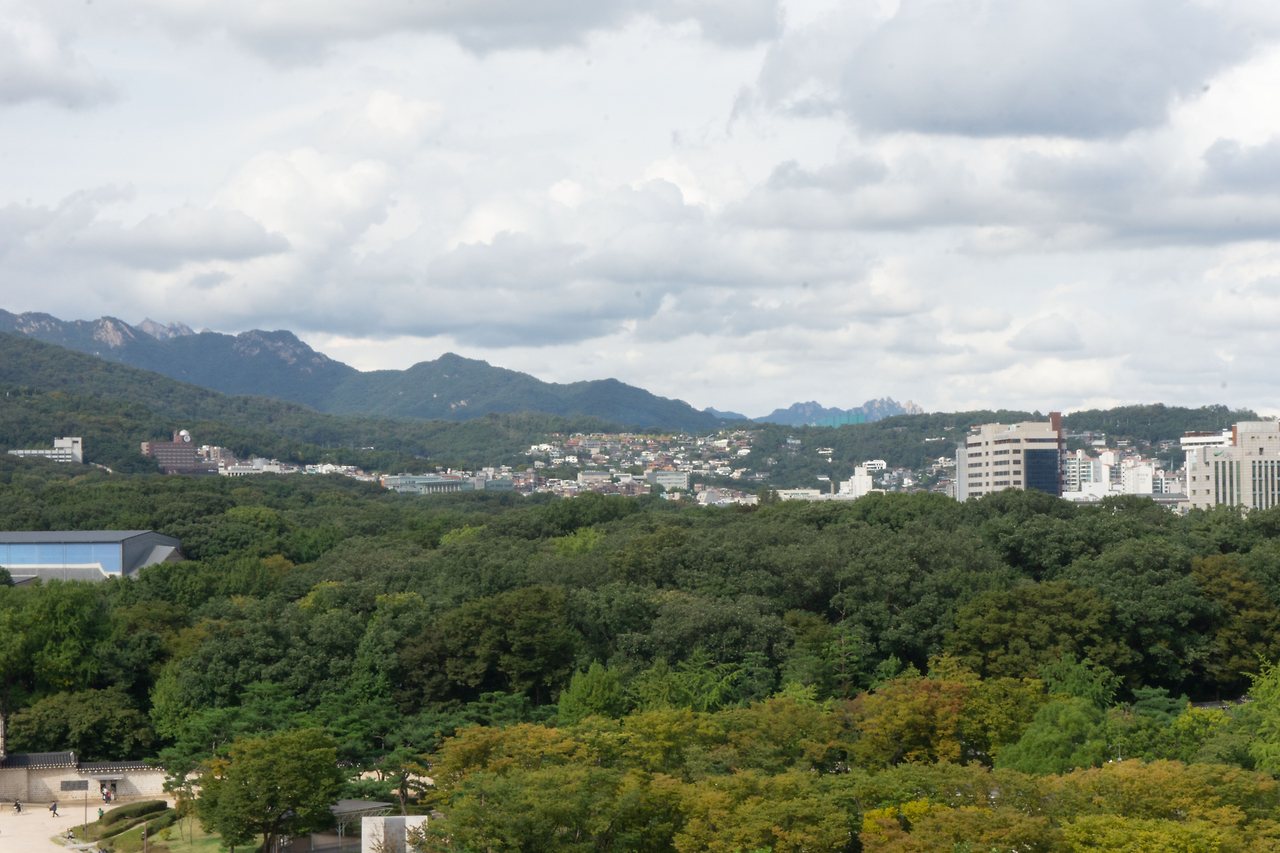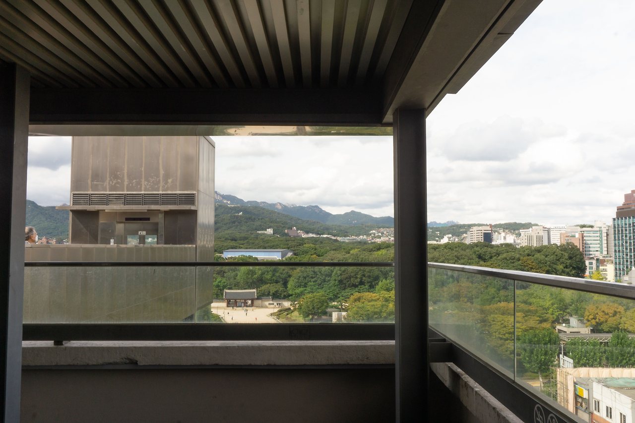 탁 트인 전경엔 파란 하늘과 종묘, 낮고 오래된 건물들이 보입니다. 뒷 쪽엔 새로 지어진 건물들이 여러 채 보이는데 고층 빌딩과 오래된 건물들이 한 프레임에 담기는 것이 이질적이면서도 묘하게 시선을 끕니다.