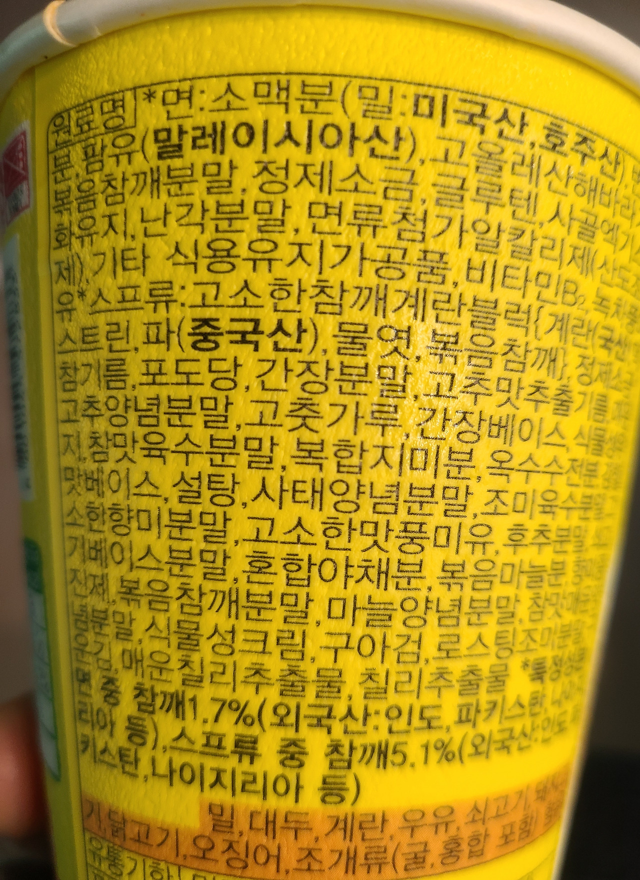 나도 국물만 좀 먹자고 하면서 한입 두입 마시며 용기 겉면에 쓰인 원료명과 원산지를 읽었다.