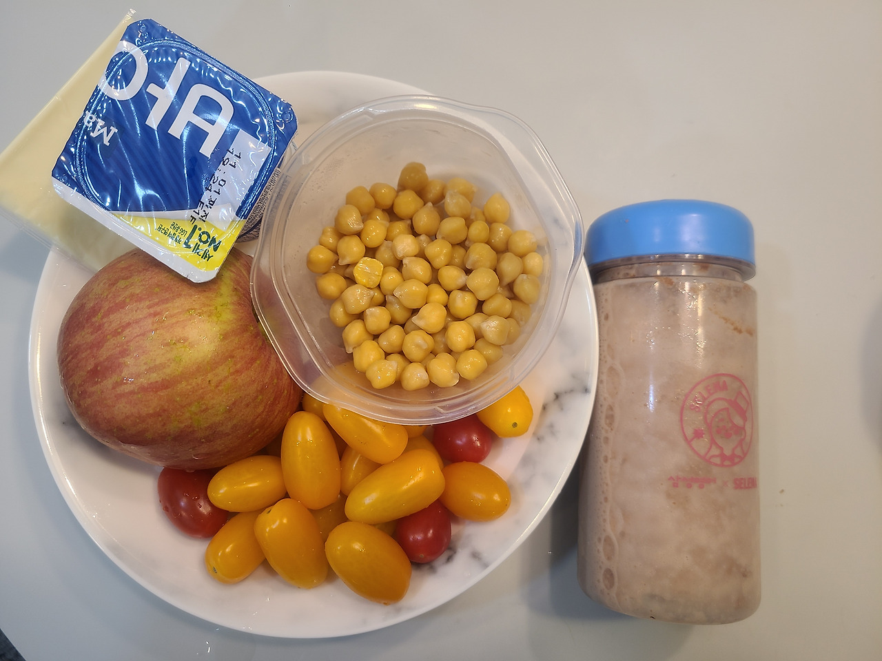 사과 70, 요거트 70, 치즈 60, 병아리콩과 방울토마토 100, 단백질 쉐이크 200