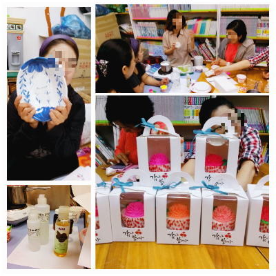 재능품앗이는 우선은 내가 나눌 수 있는 리본, 선물 공예가 주축이 되어 나에게 배움을 얻어가고 싶은 분들께 나의 재능을 나눠드렸다. 물론 한 달에 한 번씩은 수업에 참여하신 분들의 재능을 나눔 받기로 했다. 그 당시에 나와 수업에 함께했던 분들이 자격증까지는 아니더라도 꽤 다양한 분야에 소질이 있었던 분들이라, 나도 그분들덕에 꽤나 다양한 분야에 대해 배움을 얻게 되었다. 천연 비누 만들기, 팬시 우드, 천연 소이 캔들만들기, 도자기 페인팅 등등. 뜻밖에도 이런 좋은 분들이 나와 뜻을 맞추어, 함께 하며 서로의 재능을 그렇게 알아가게 되었다. 가끔은 서로의 집에 초대받아 즐거운 수다와 함께 서로를 알아가며 배움도 함께 하는 시간이 더없이 행복했다. 그 덕분에 나도 천연 비누와 캔들, 화장품 공예에 더 관심이 가서 새로운 자격증을 더 취득하게 되었고 말이다.