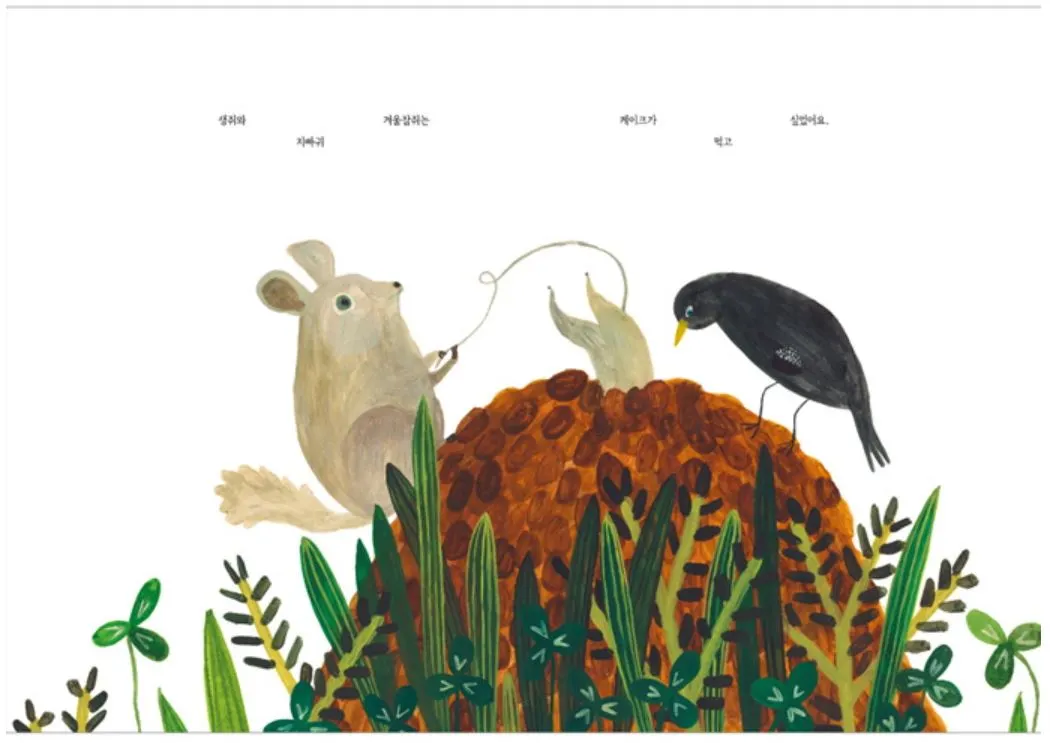 이럴 경우 정답은 대부분 그림에서 찾게 된다. 역시 그림을 뜯어보니 생쥐의 노력이 보인다. 생쥐는 달걀을 찾으러 갈 때 가장 앞장서서 걷고, 두더지를 만나기 위해 깜깜한 땅굴에 용감하게 몸을 던진다. 친구들이 가져온 케이크 재료를 섞는 것도 생쥐고, 자기 몸보다 큰 반죽 그릇을 짊어지고 오븐을 찾아가는 것도 생쥐다.