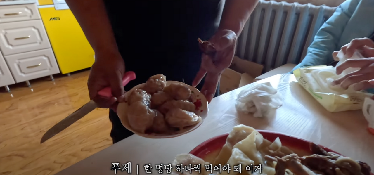 몽골의 양고기는 음… 뭐랄까. 할 말을 잃게 만드는 맛이다. 한국의 양고기는 양이 아닌 것처럼 느껴진다. 그냥 다른 고기라고 보는 게 맞겠다. 먹어보지 않으면 절대 모를 맛이다. 돼지고기 비린내와는 다른 차원의 냄새가 난다. 몽골은 우리나라처럼 어린 양을 잡지 않고 다 큰 양을 잡아 먹기 때문에 어린 양보다 당연히 냄새가 날 수밖에 없는데, 고기에 간을 거의 하지 않는다고 보면 된다. 그냥 ‘익힌 양고기'를 먹는다고 보면 되는데, 이걸 어떻게 설명해야 할지 모르겠다. 아무튼, 일주일 정도가 지나자 음식때문에 고통스러울 지경이었다. 육백수 중에는 나, 나무언니, 준수 세 명이 양고기에 거부감을 많이 느꼈고, 유진언니, 지아씨, 준열이는 잘 먹었다. 사람마다 비린내를 느끼는 정도도 다르니 이건 도저히 먹어보지 않고는 알 수가 없는 노릇이다. 몽골 여행에 가는 사람이 있다면 앞으로는 쌈장이나 고추장, 김을 제발 가져가라고 말할 것이다.