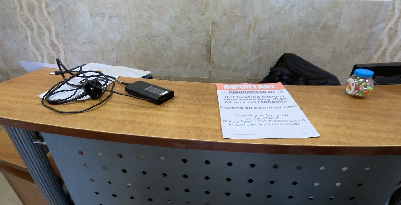 울란바토르의 첫인상은 굉장히 추웠다. 우리는 5월 초에 도착했는데 공항을 나오자마자 처음으로 했던 말이 ‘생각보다 춥다'였다. 매니저님이 배우 조진웅을 닮았다고 소개해준 푸제 가이드와 어색하게 첫 인사를 하고, 차에 짐을 실었다. 시내로 가는 길은 꽤나 멀었다. 아니, 거리가 먼 것보다 차에 갇혀있어서 길게 느꼈을지도 모른다. 정말 거짓말 하나 보태지 않고 한시간은 차가 움직이질 못했다. 그렇게 다들 피곤에 쩌든 상태로 울란바토르 숙소에 도착했는데, 하필이면 우리가 간 날 울란바토르 전역의 히터가 작동하지 않는다고 했다. 그리고 숙소 리셉션에 남겨져있던 안내문 하나.