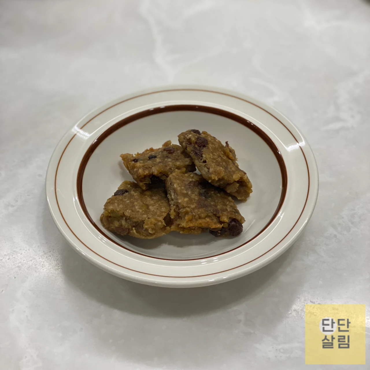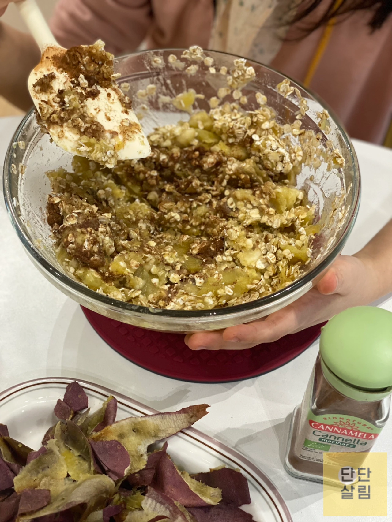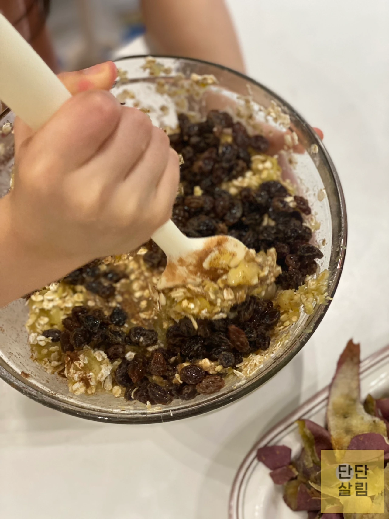 오트밀, 고구마, 바나나, 건포도 등을 넣어서 반죽을 만든 다음 에프에 굽기