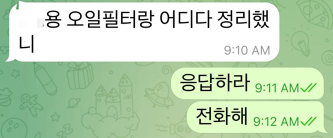 과거에 구매하고 창고에 보관 중인 부품에 대해 질문하는 건지 아니면 이번에 구매한 건지 정확한 확인이 필요했다. 또한 자동차 관련 지식이 전무한 내가 알 턱이 있나. 톡으로 설명하려니 운동 중에 번거로워서 바로 전화를 걸었다. 하지만 메시지를 받고 바로 전화를 걸었는데도 남편은 전화를 받지 않았다.