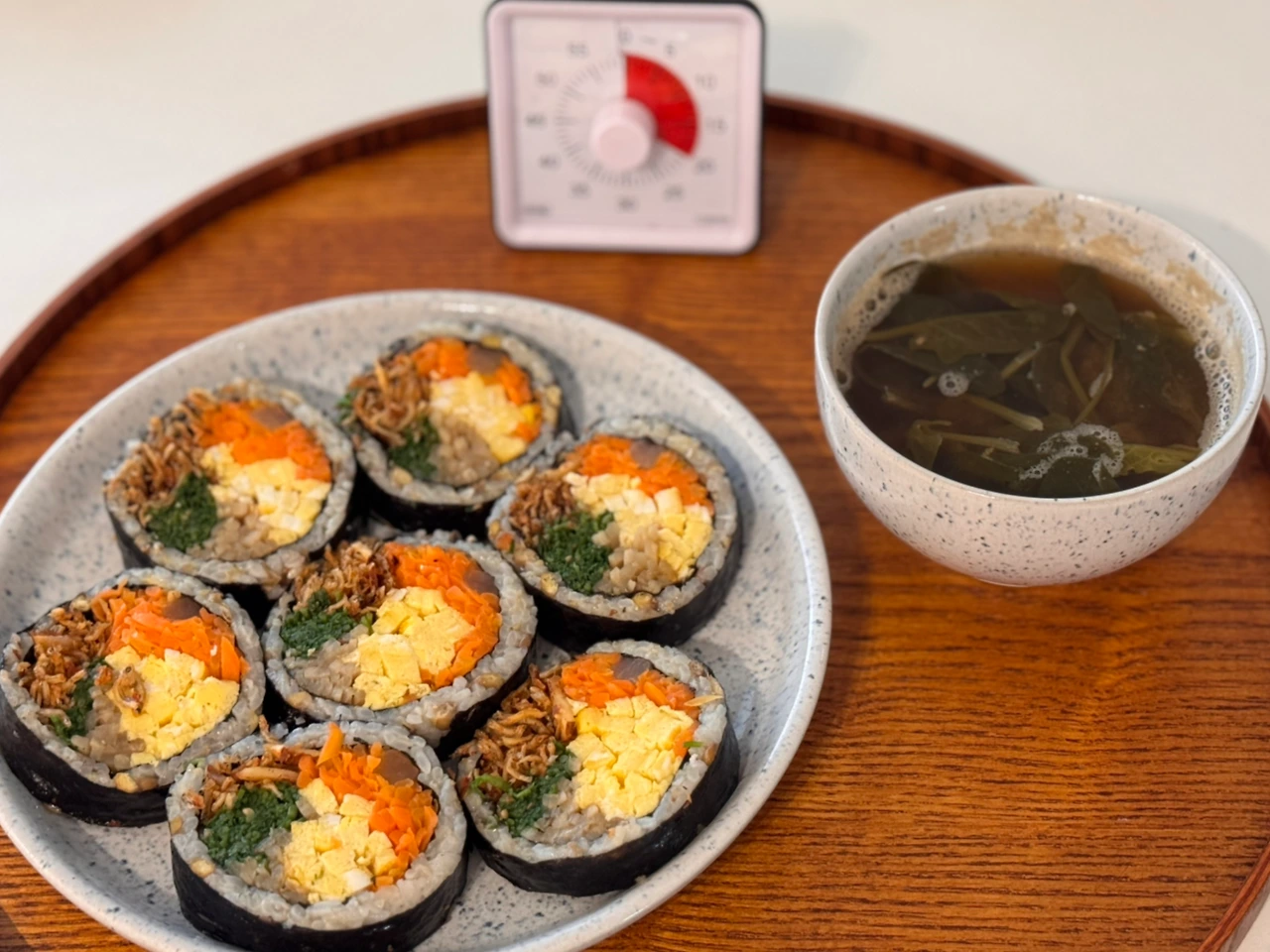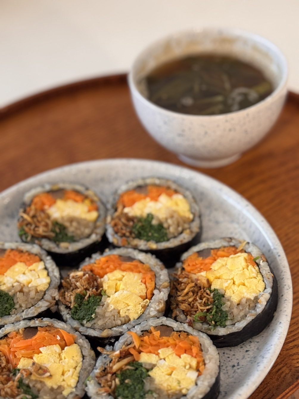 혼자서 집밥을 먹으려니 차리는 게 너무 귀찮았다. 그래서 우리네 엄마들처럼, 남은 반찬에 고추장 넣고 비벼 먹는 게 더 편하다는 걸 깨달았다. 어렸을 때는 그 모습을 별로 좋아하지 않았지만, 이제 그 마음을 이해하게 되었다. 하지만 비빔밥도 계속 먹다 보니 질려버렸고, 푹푹 비벼 먹는 비빔밥을 반복적으로 먹으면 내 몸도 결국 비빔밥처럼 풍성해질 것만 같았다. 그러다가 문득 떠오른 메뉴가 있었으니 그건 바로 김밥이었다.