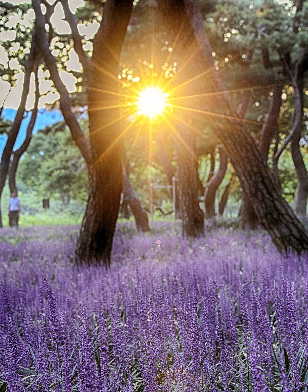 한눈에 보이는 전체의 풍경, 소나무 사이로 비치는 햇빛과 맥문동 군락을 전경(全景)으로 찰칵.