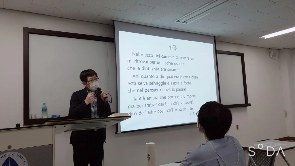 이탈리아 볼로냐 대학에서 박사학위를 받고, <장미의 이름으로>라는 소설로 우리에게 잘 알려져 있는 움베르토 에코의 애제자였던 김운찬 교수가 이탈리어 원어로 '신곡의 1곡 인트로'를 읽어 주고 있다.