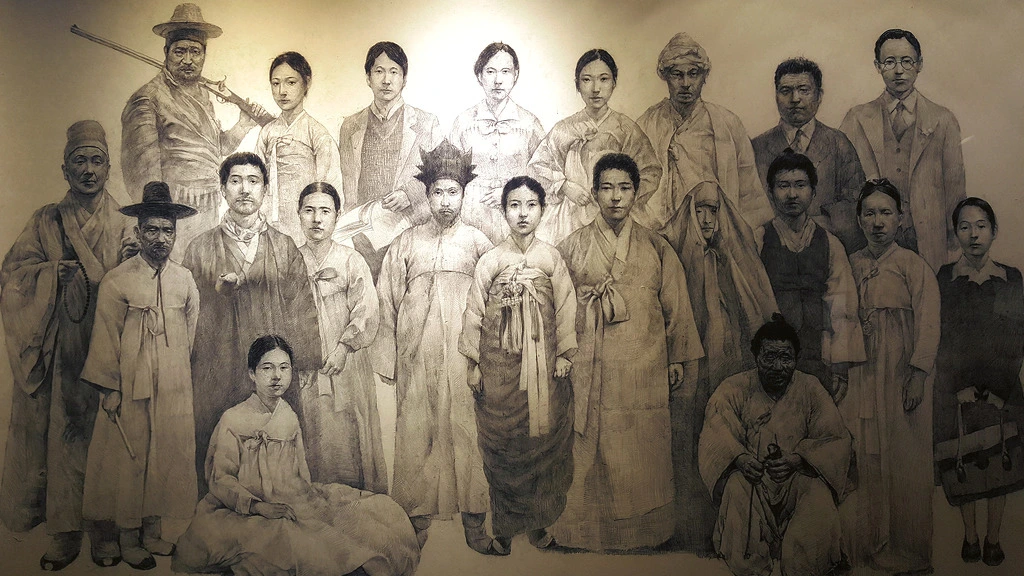 -소설 <토지> 등장인물도. 중앙 한복 입고 있는 이가 주인공 최서희다- (얼마 전 지리산 자락 하동 박경리 문학관에서 찍음)