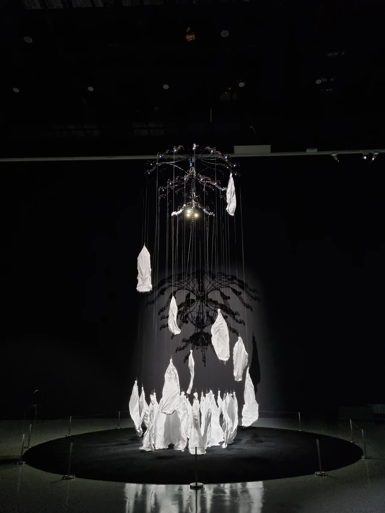 첫 번째, 최우람 <예쁘게 시들어 가고 싶어 너와> 란 작품은 첫 느낌은 무서움이었다. 아무도 없는 낮시간의 깜깜한 전시실, 의문의 하얀 무언가... 몽환적인 음악이 긴장을 고조시킨다. 작품해설을 보고 이해하면 덜 긴장될까 팸플릿을 보지만 너무 어두워 보이지 않아 결국 프레시를 켰다 끈다. 자리에 앉았고 서서히 움직이는 하얀 무언가가 눈길을 끌고 집중하게 만들었다. 꽃이 지고 피는 과정에서 시들어 가는 한 세대와 피어나는 다음 세대, 되돌아오는 죽음을 연결한 작품이란다. 내 눈에는 하늘로 올라가는 영혼을 보듯 위로 가는 꽃잎에만 시선을 고정했다. 늙어가는 나이기에 언제가 있을 죽음에 나를 투영했는지도 모르겠다.