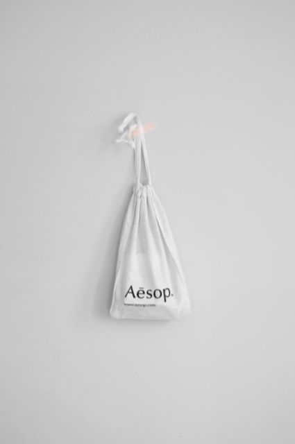 이솝의 상징과도 같은 갈색병은 자외선 차단의 역할을 하며 방부제를 최소한으로 하기 위해 고안되었다. 모든 병, 포장 등의 패키지는 재활용 재료를 활용하고, 식물성 콩기름 잉크로 인쇄를 한다. 패키지에는 담백하게 기재한 효능과 성분, 격언 한 문장. 제품을 구매하면 종이백 대신 패브릭 파우치에 담아주는데, 나는 아직도 이 파우치를 세면용품을 담아 사용 중이다.