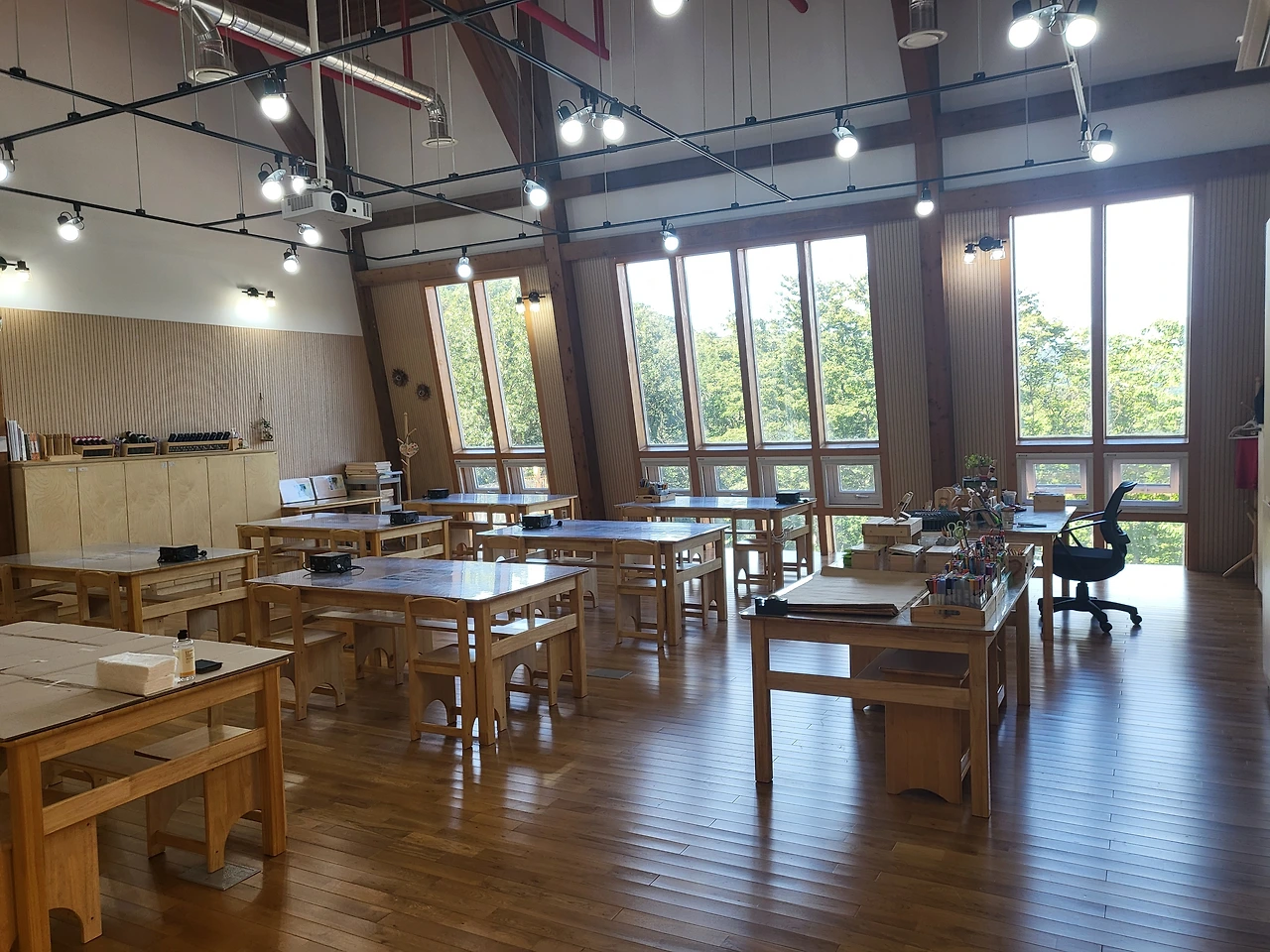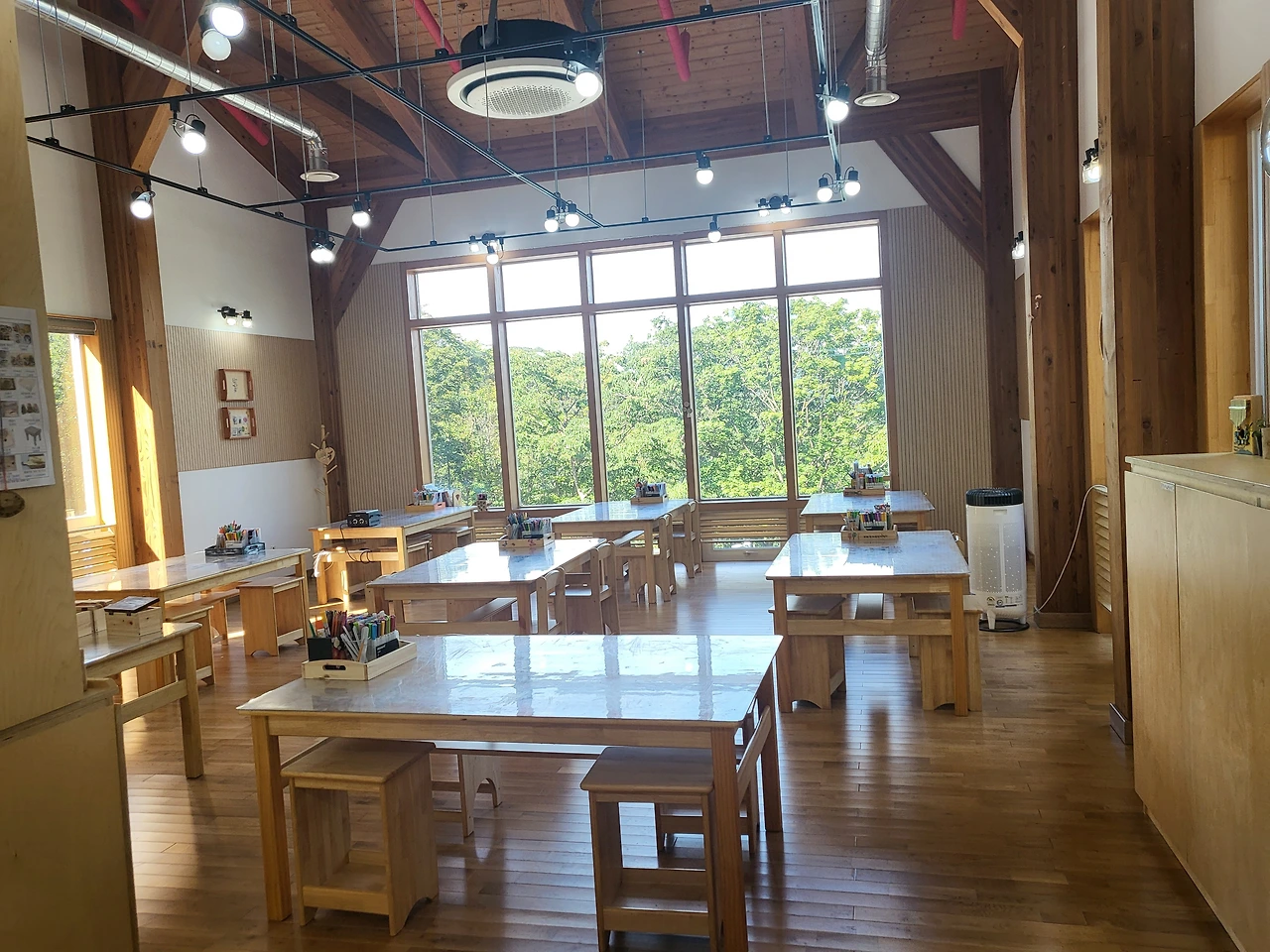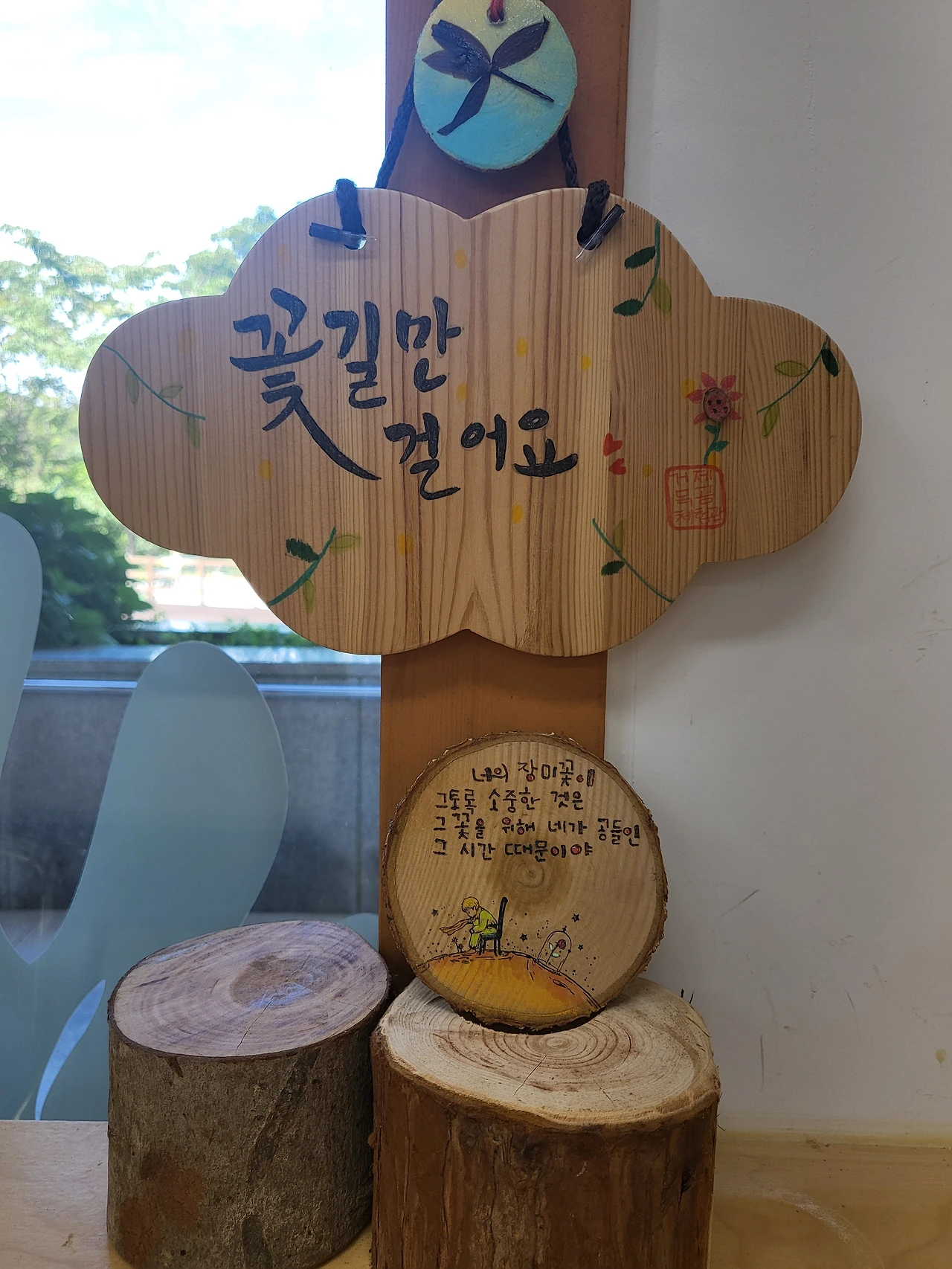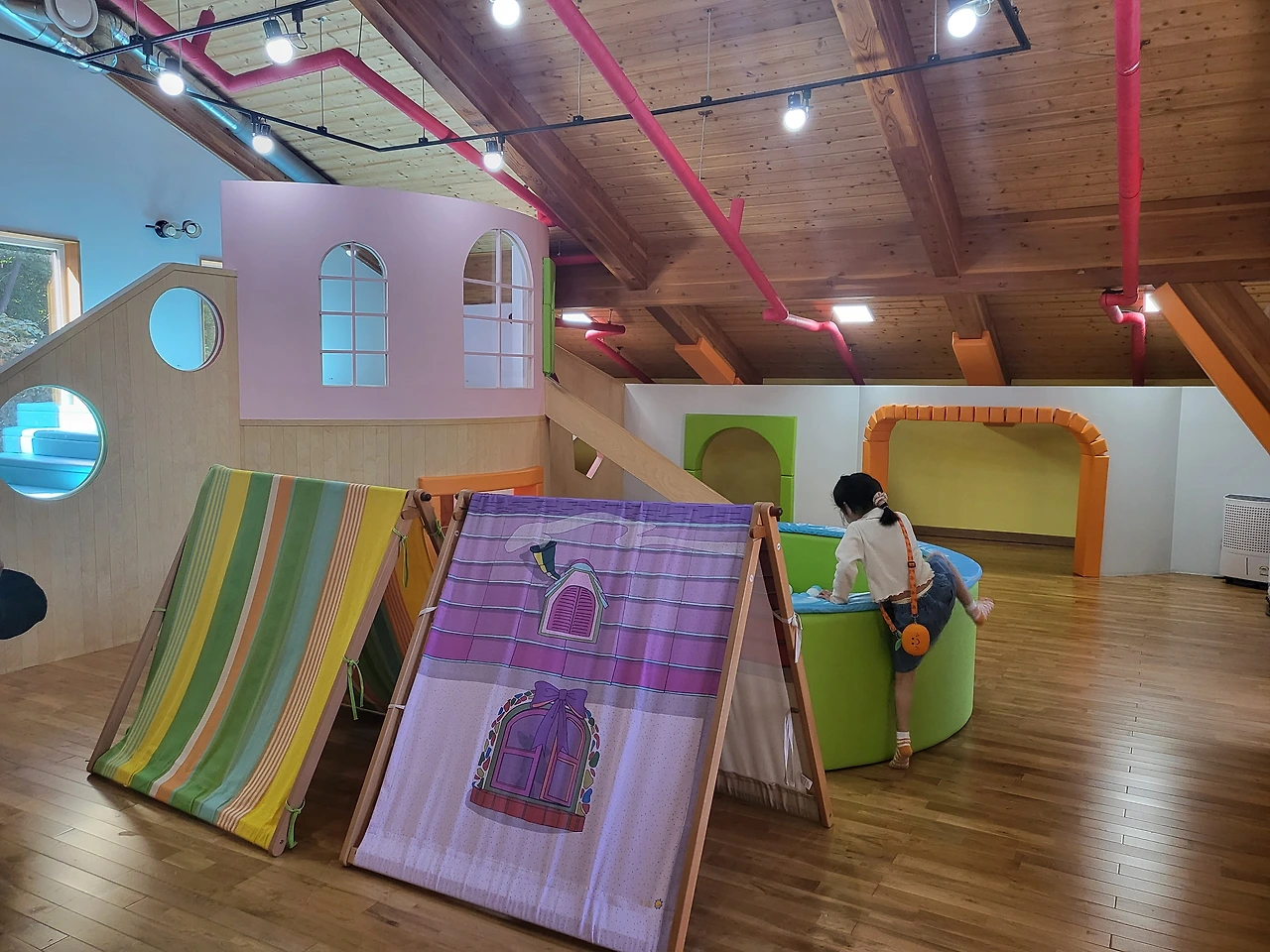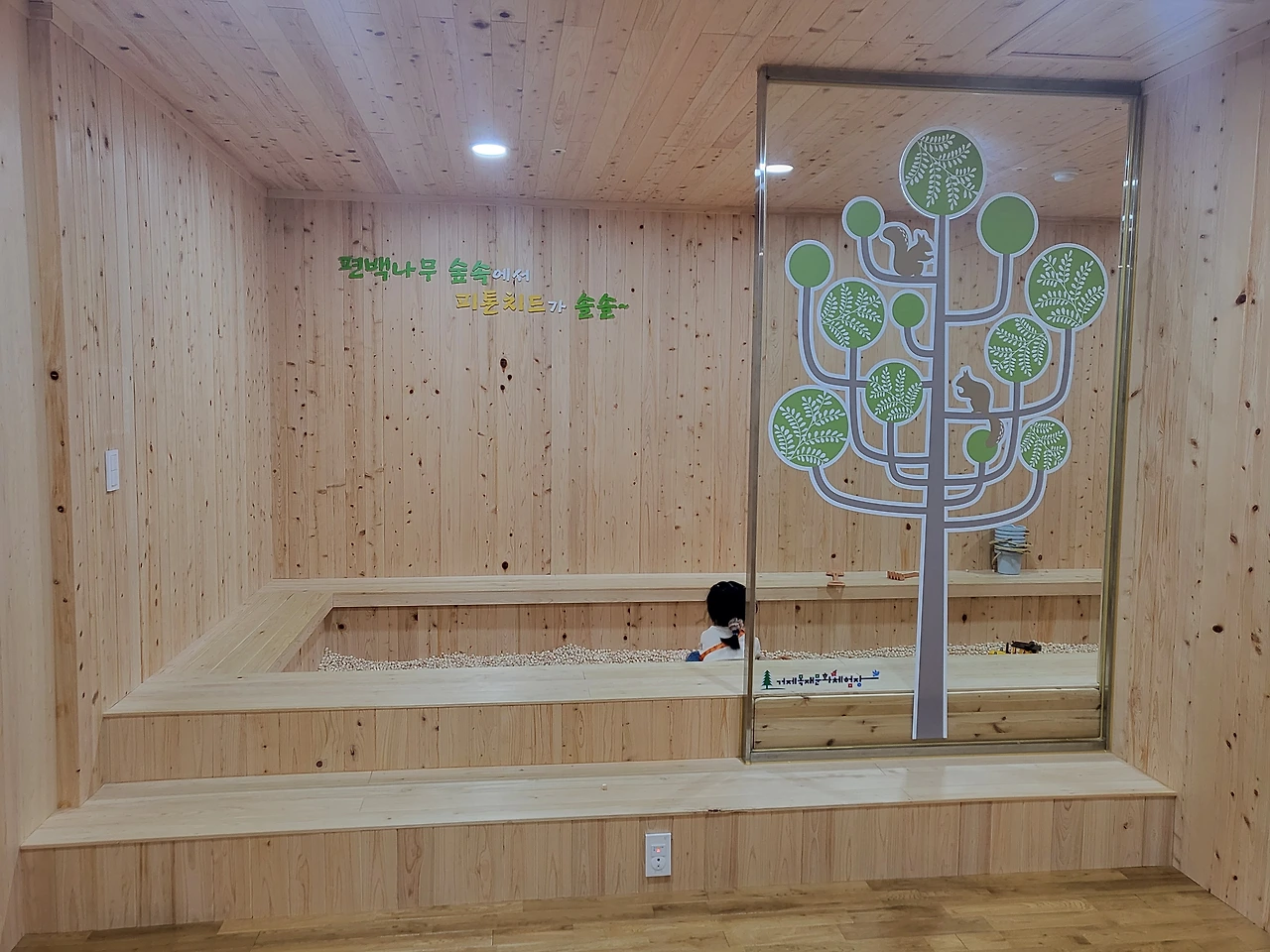 가끔 키즈카페 가면 갑갑하게 느껴졌는데 여긴 탁 트인 느낌이 들고 나무 내음 때문에 편안해졌다.