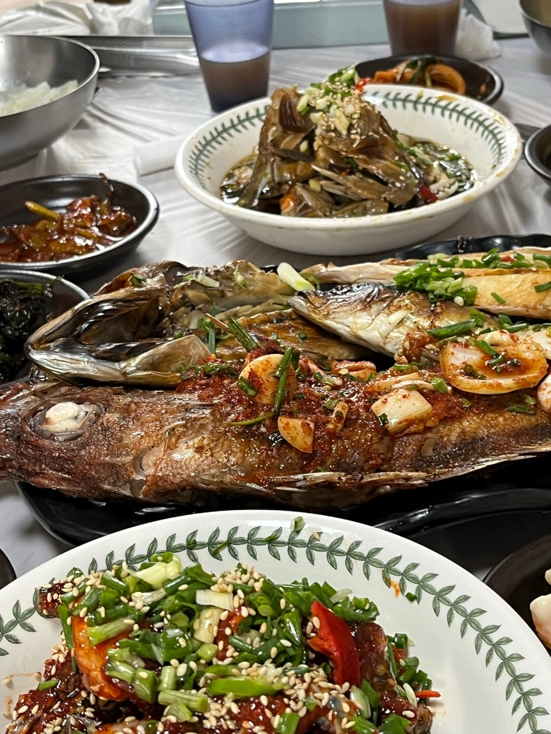 가운데 생선구이를 두고 사이드로 양념과 간장게장 놓아두시고 갖은 반찬들을 둘러놓는다.