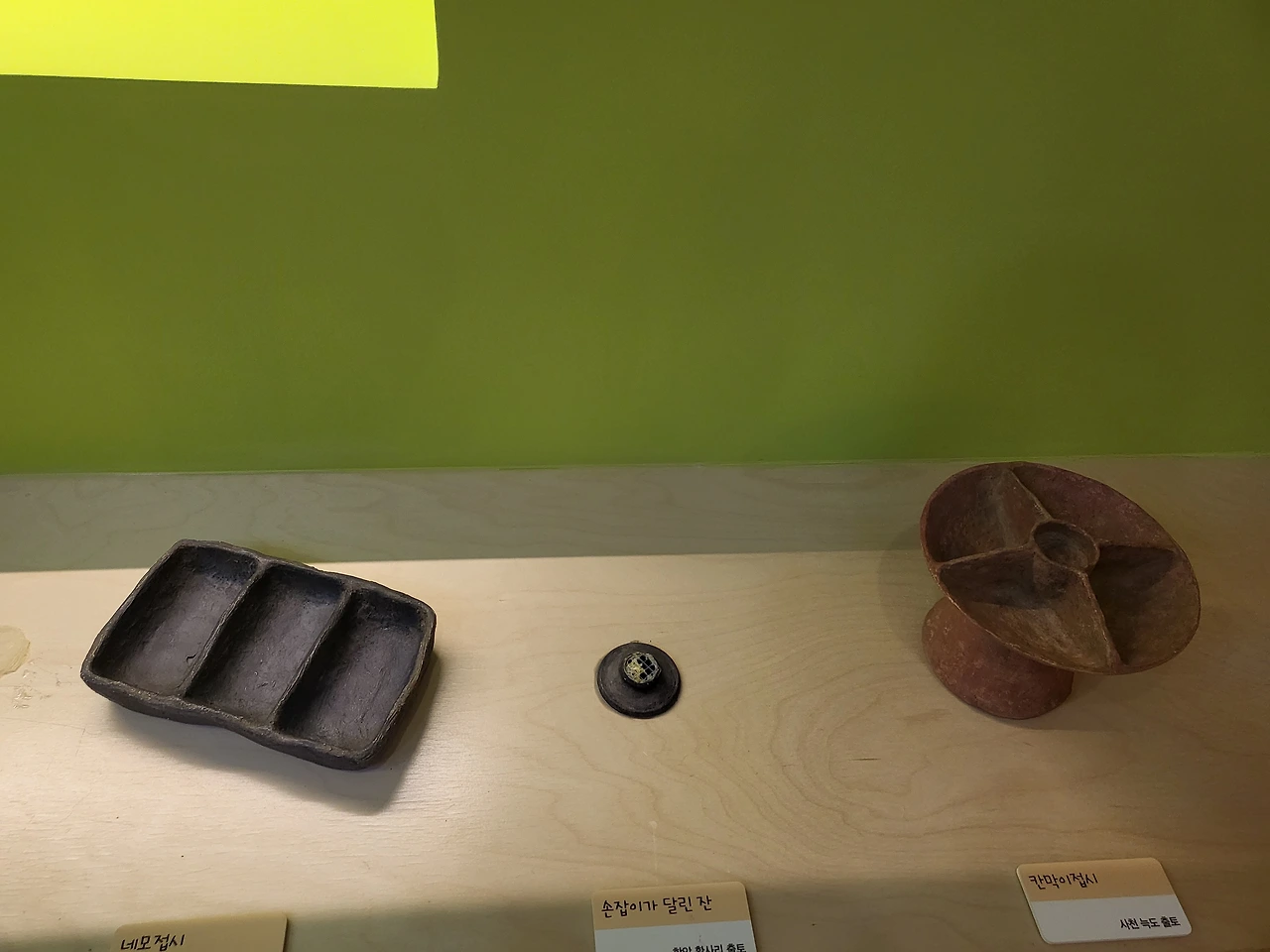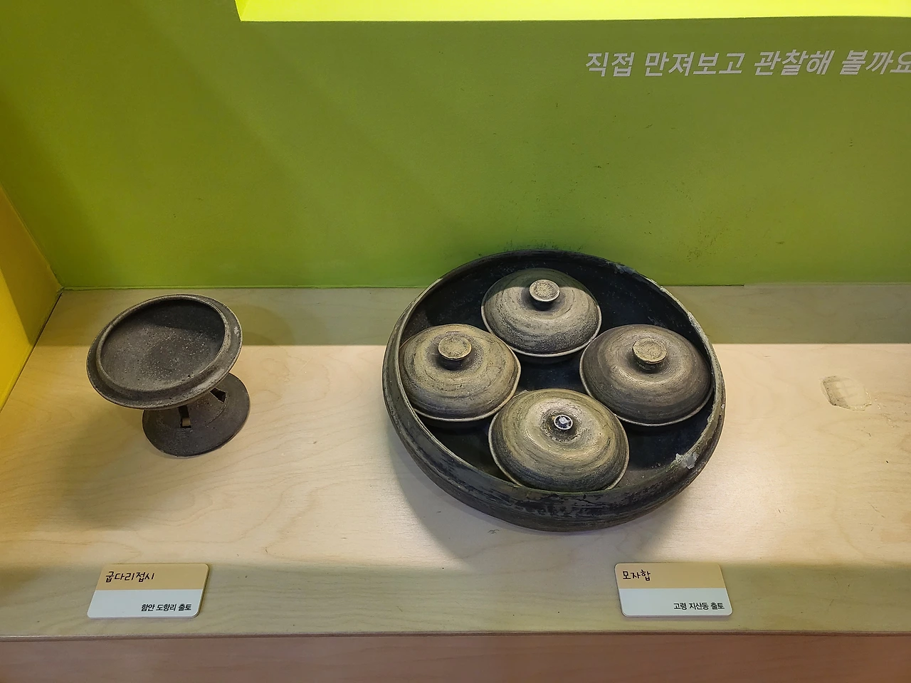 토기 모형들 직접 만져 볼 수 있어요. 단 뚜껑은 열리지 않아요.