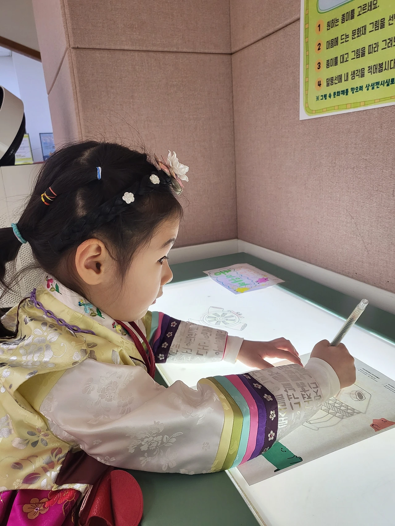 "저 한복 입고 왔어요!" 하며 선물을 기다리는 아이.(선물에 진심이다.)