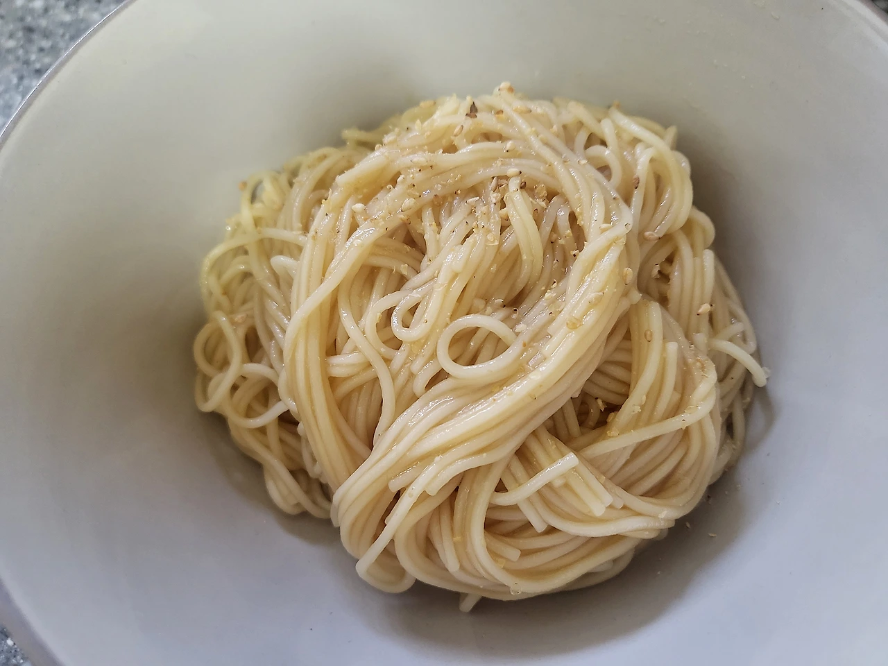 다 삶은 소면에 간장과 설탕 참기름으로만 버무린다.(소면의 양에 따라 양념의 양을 달리 하세요. 저는 1.5인분 소면을 삶았기에 진간장 3 숟갈, 참기름 한 숟갈, 설탕 0.7 숟갈 넣고 버무렸어요.)